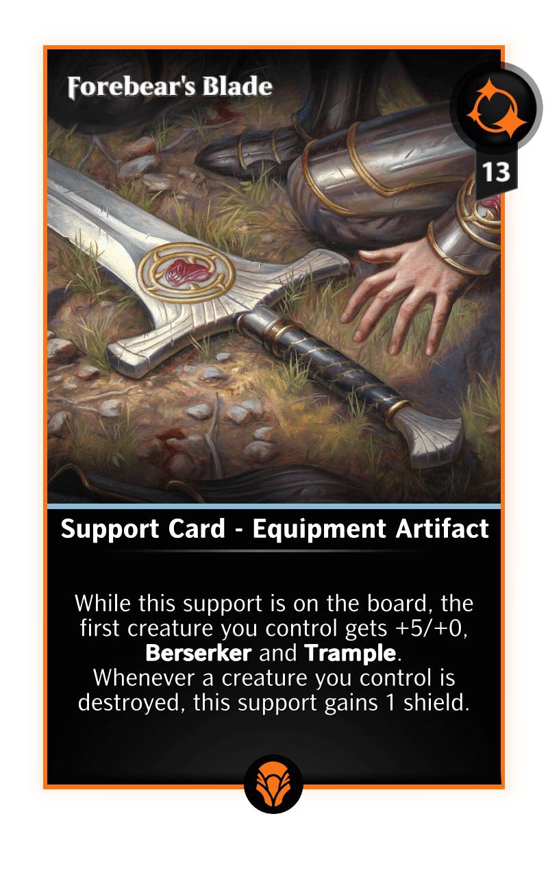 While this support is on the board, the first creature you control gets +5/+0, Berserker and Trample. Whenever a creature you control is destroyed, this support gains 1 shield.