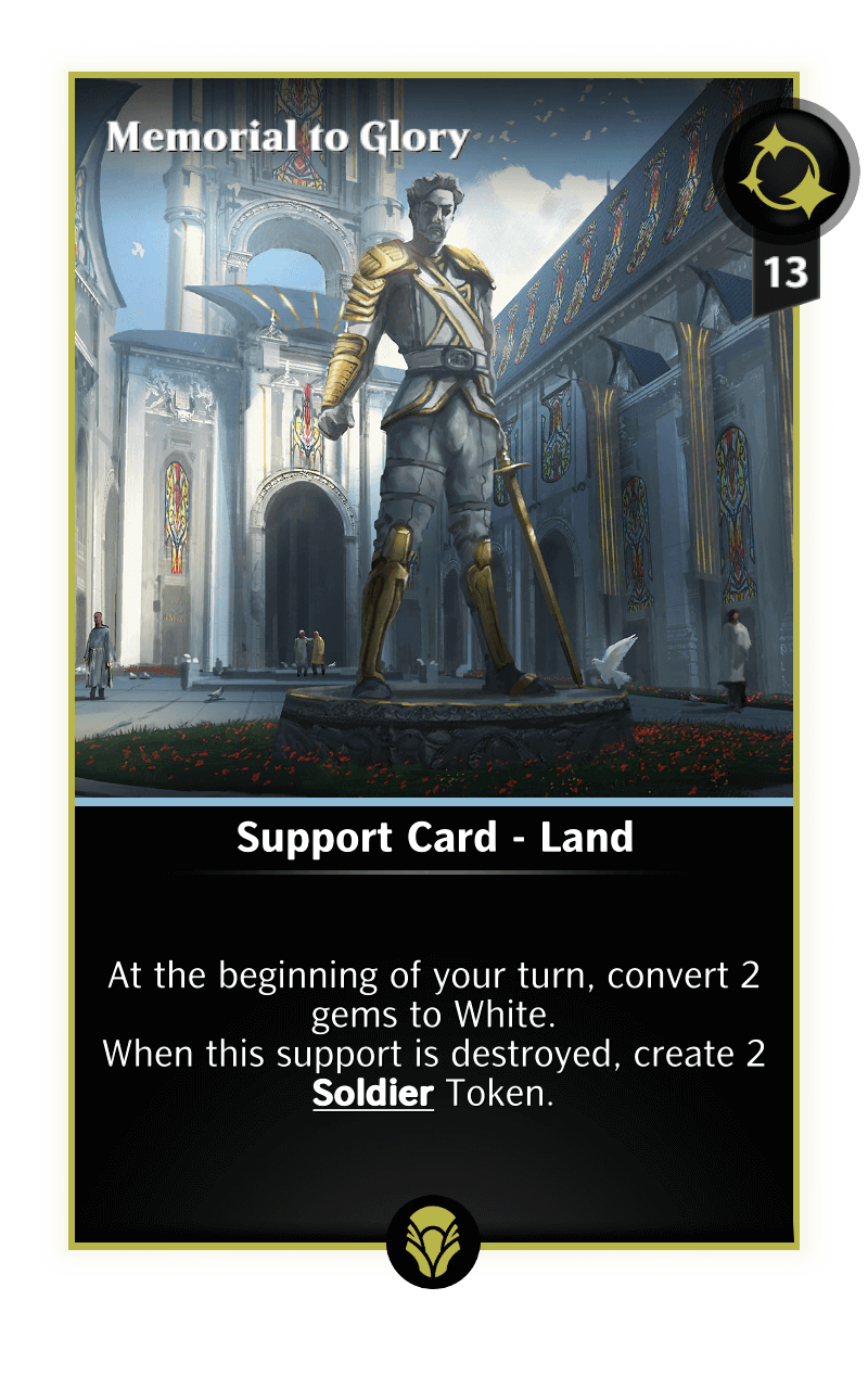 At the beginning of your turn, convert 2 gems to White. When this support is destroyed, create 2 Soldier Token.