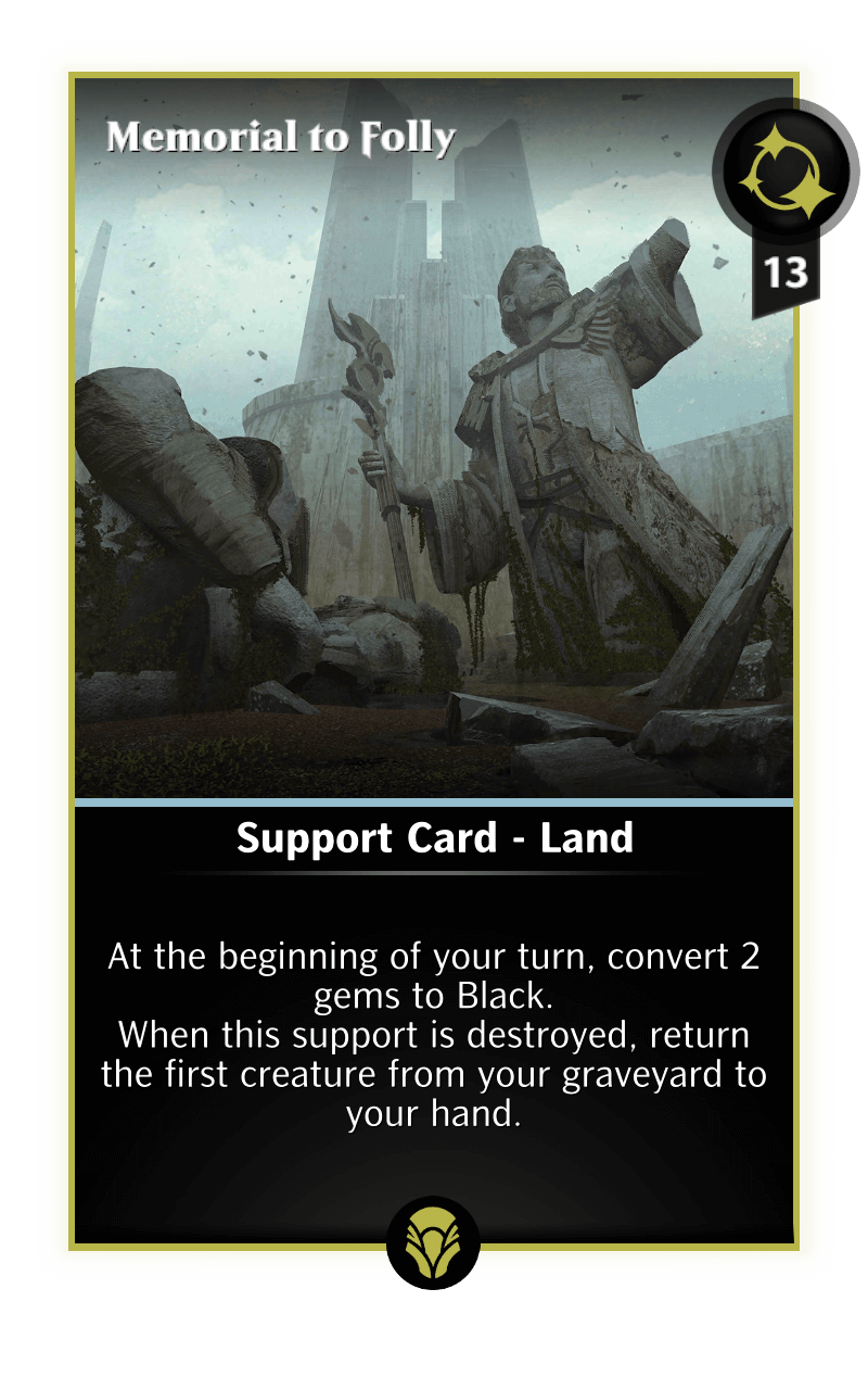 At the beginning of your turn, convert 2 gems to Black. When this support is destroyed, return the first creature from your graveyard to your hand.