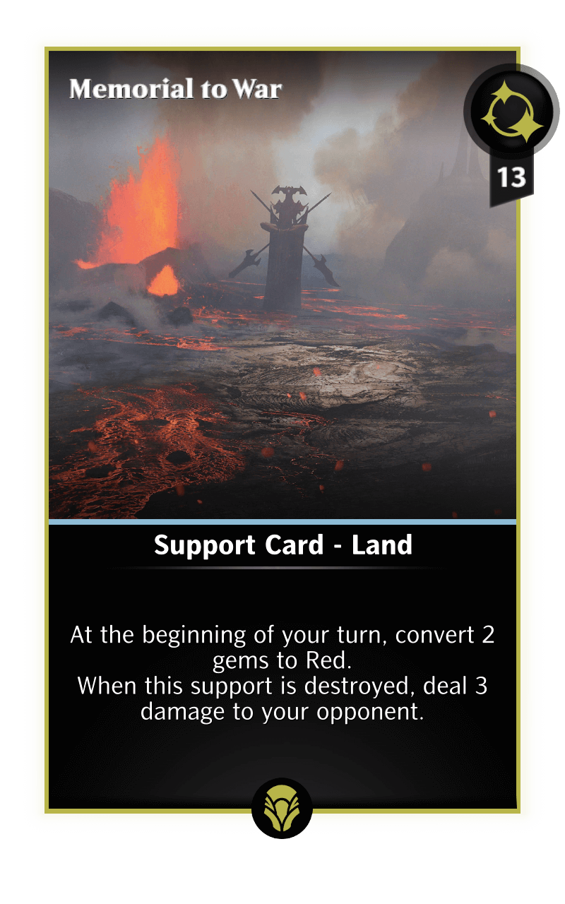 At the beginning of your turn, convert 2 gems to Red. When this support is destroyed, deal 3 damage to your opponent.