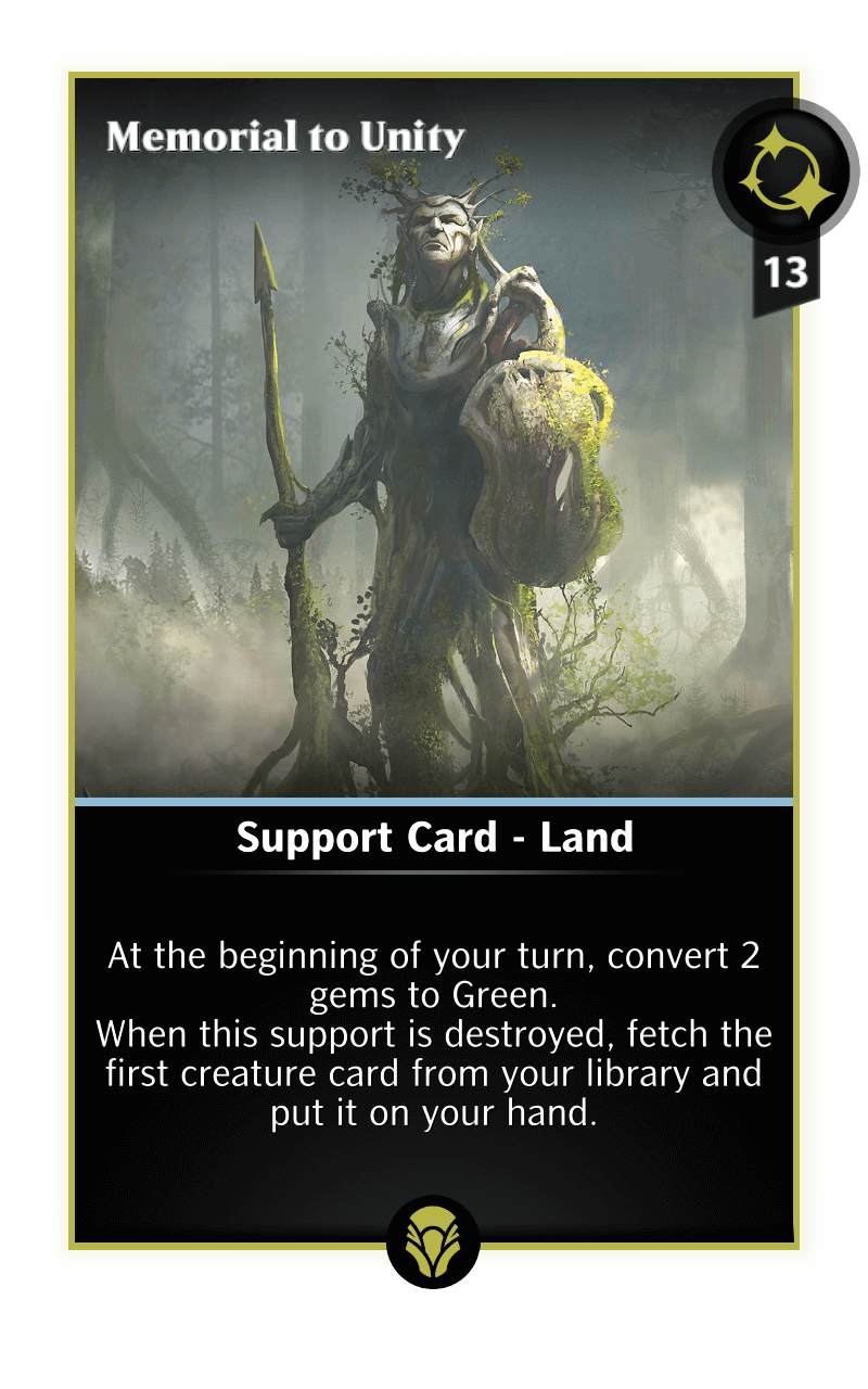 At the beginning of your turn, convert 2 gems to Green. When this support is destroyed, fetch the first creature card from your library and put it on your hand.
