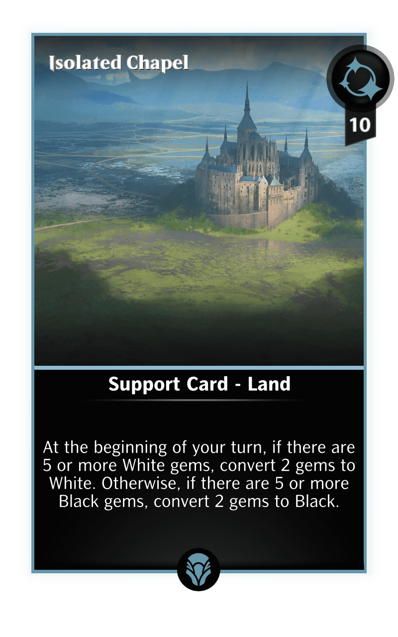 At the beginning of your turn, if there are 5 or more White gems, convert 2 gems to White. Otherwise, if there are 5 or more Black gems, convert 2 gems to Black.