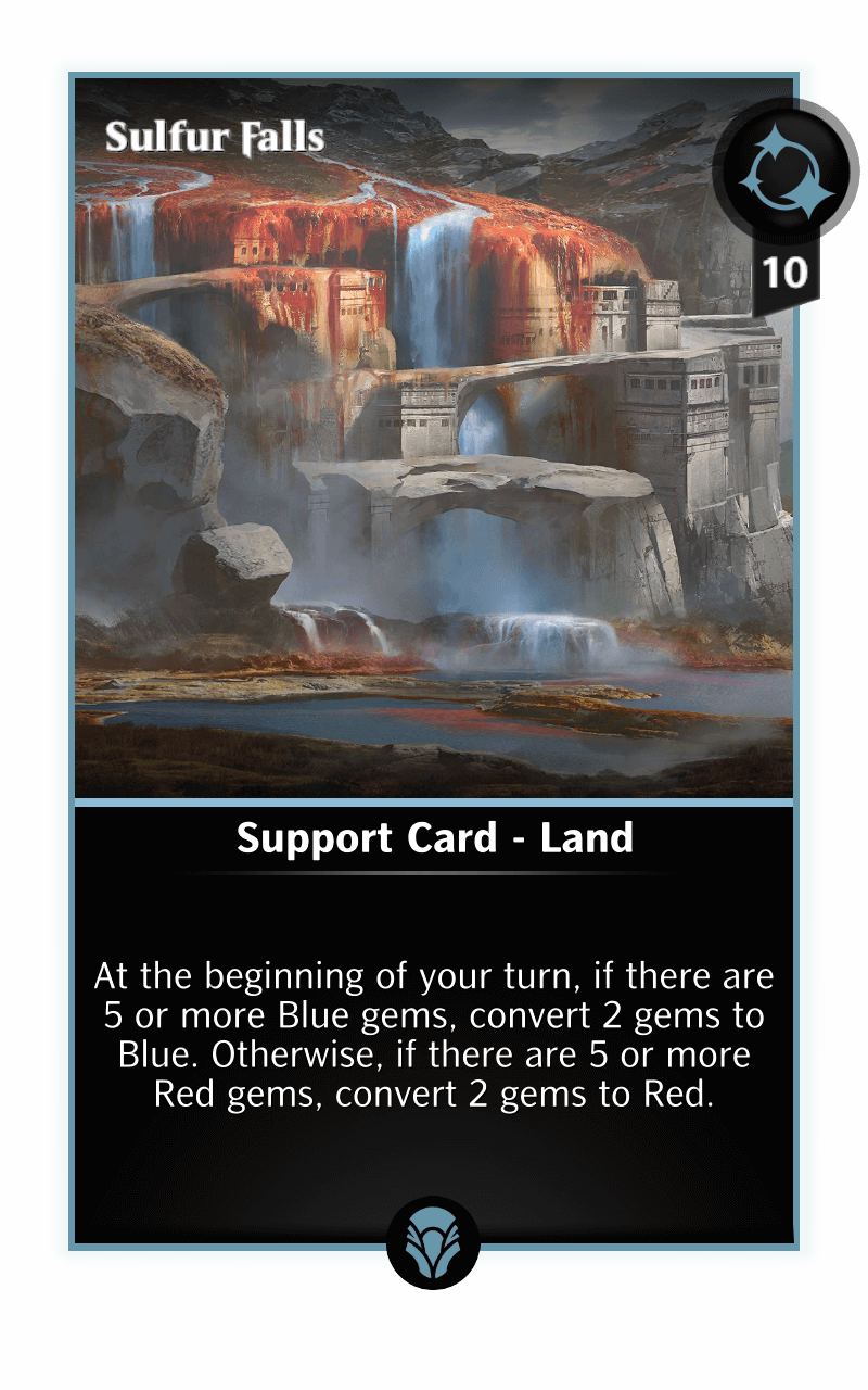 At the beginning of your turn, if there are 5 or more Blue gems, convert 2 gems to Blue. Otherwise, if there are 5 or more Red gems, convert 2 gems to Red.
