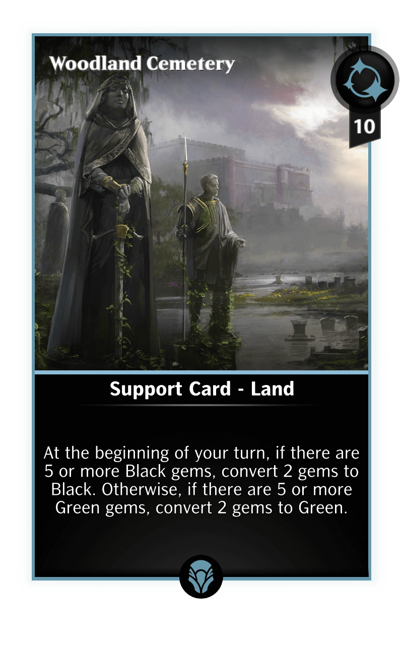 At the beginning of your turn, if there are 5 or more Black gems, convert 2 gems to Black. Otherwise, if there are 5 or more Green gems, convert 2 gems to Green.