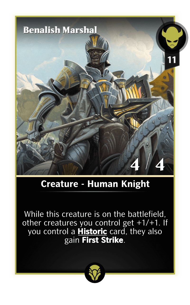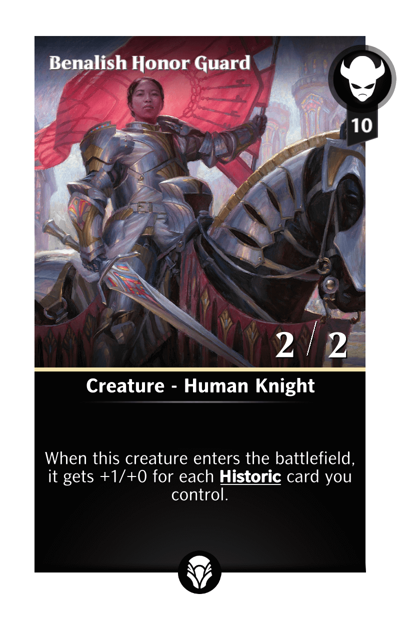 While this creature is on the battlefield, other creatures you control get +1/+1. If you control a Historic card, they also gain First Strike.