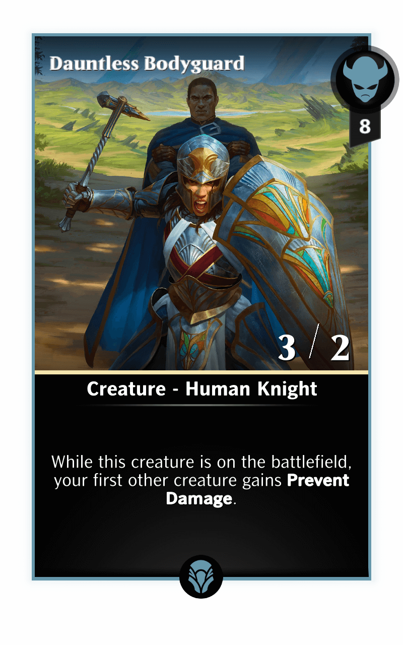 While this creature is on the battlefield, your first other creature gains Prevent Damage.
