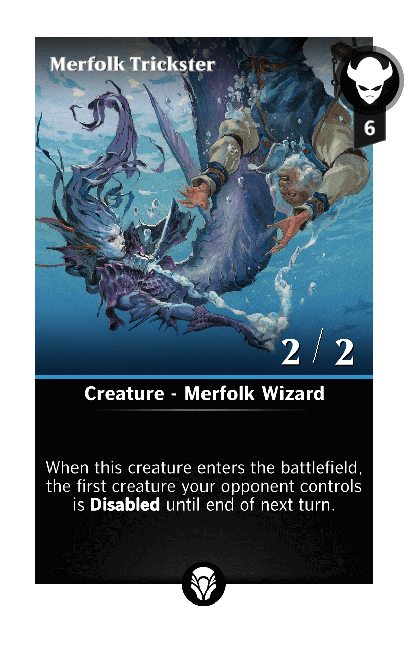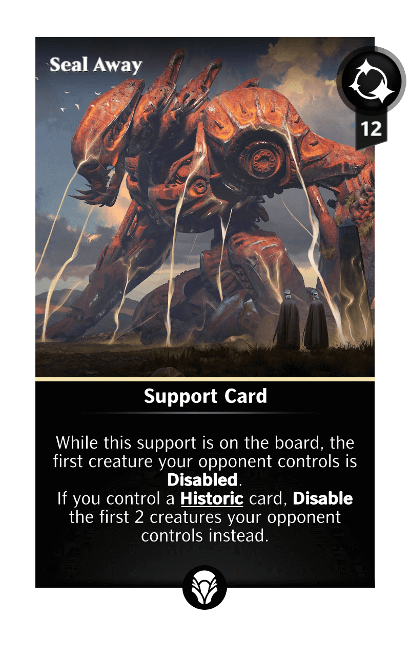 While this support is on the board, the first creature your opponent controls is Disabled. If you control a Historic card, Disable the first 2 creatures your opponent controls instead.