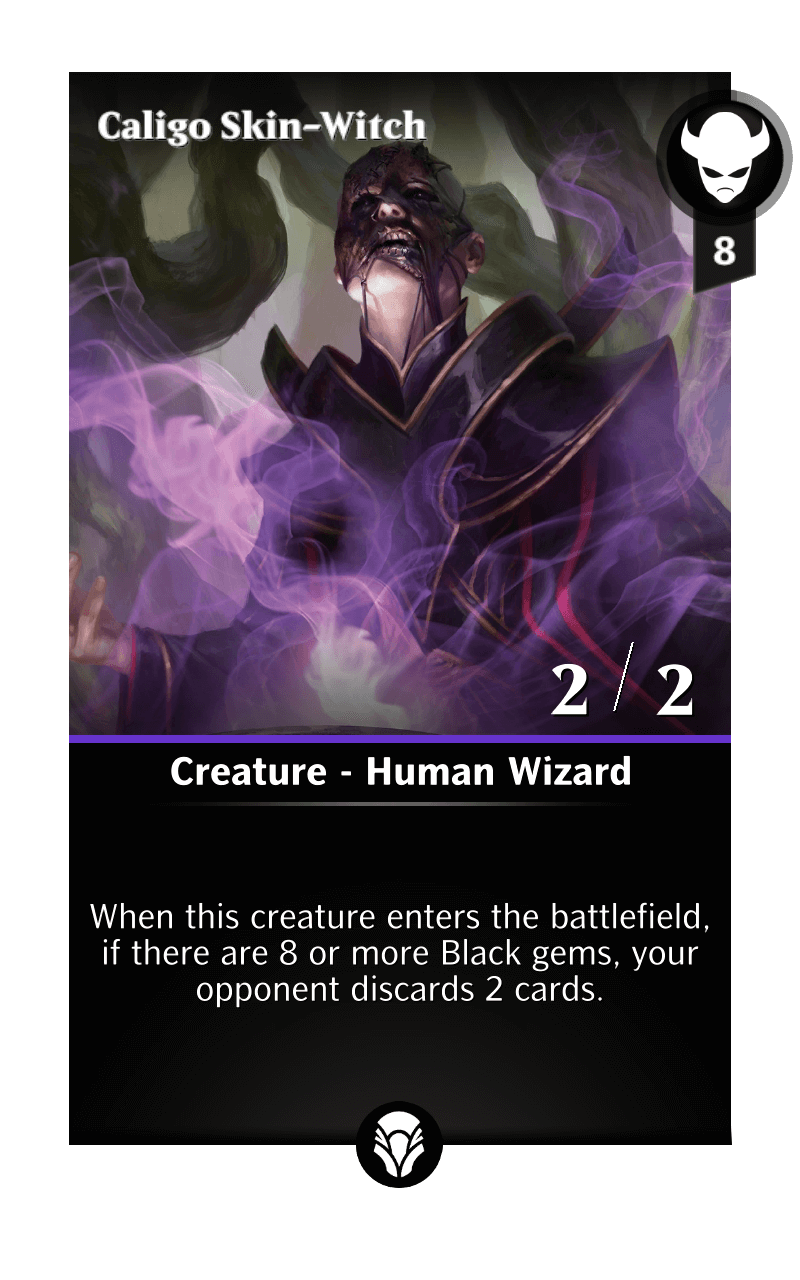 When this creature enters the battlefield, if there are 8 or more Black gems, your opponent discards 2 cards.