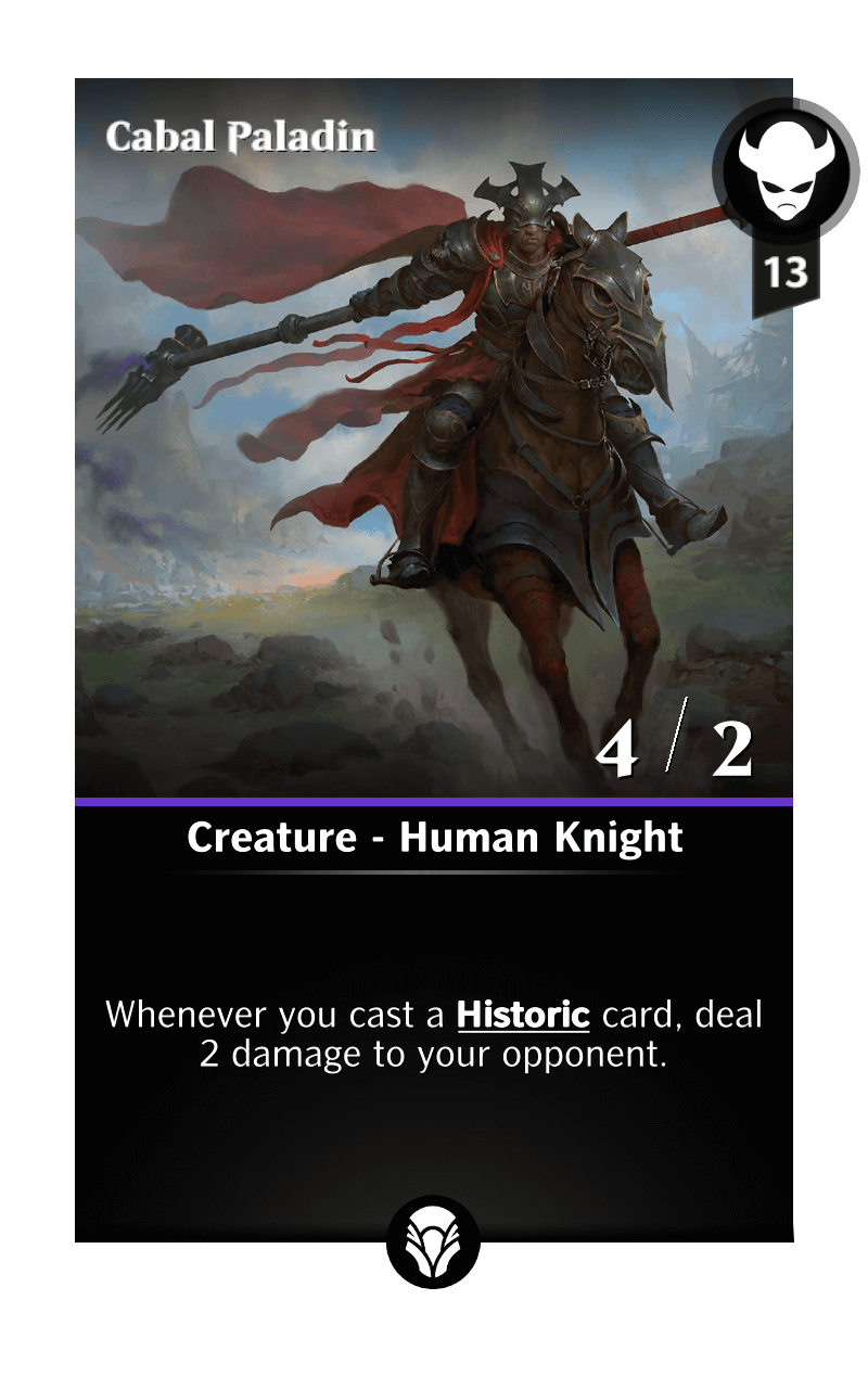 Whenever you cast a Historic card, deal 2 damage to your opponent.