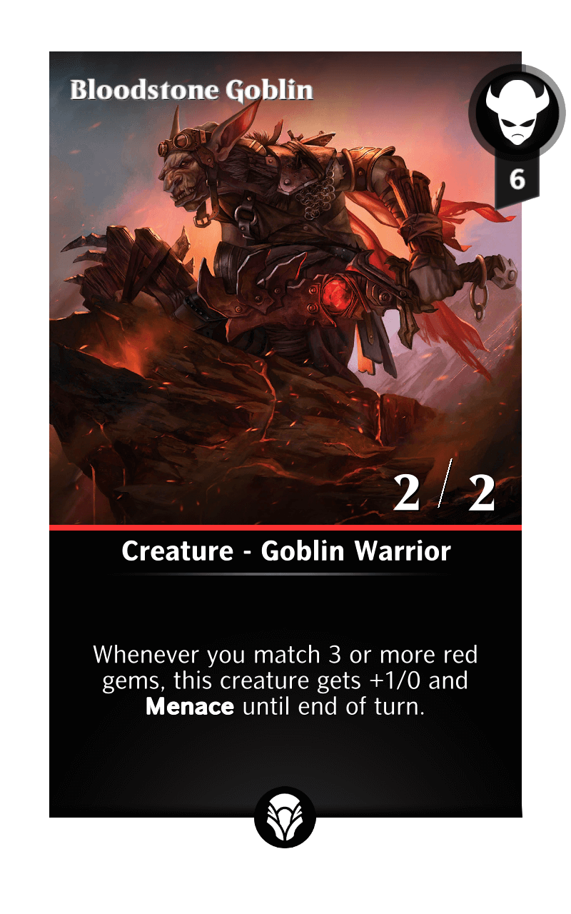 Whenever you match 3 or more red gems, this creature gets +1/0 and Menace until end of turn.