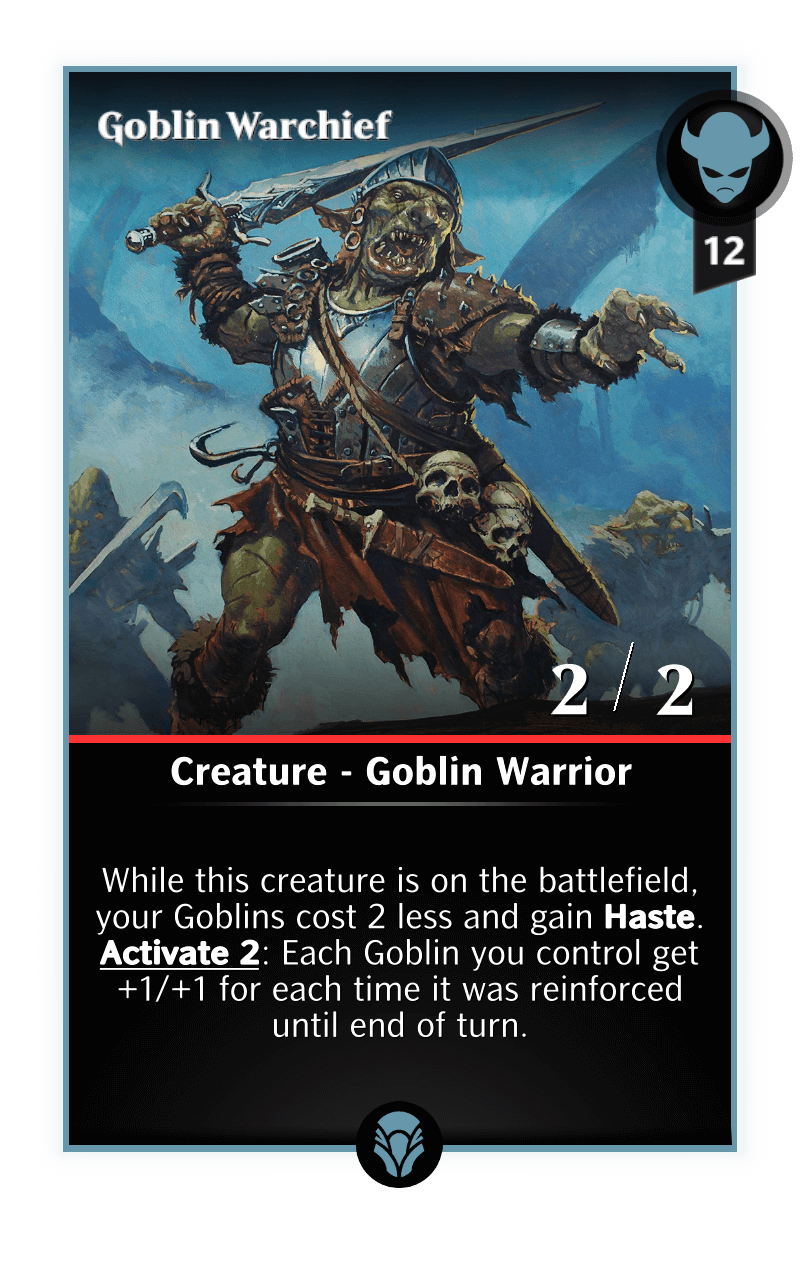 While this creature is on the battlefield, your Goblins cost 2 less and gain Haste. Activate 2: Each Goblin you control get +1/+1 for each time it was reinforced until end of turn.