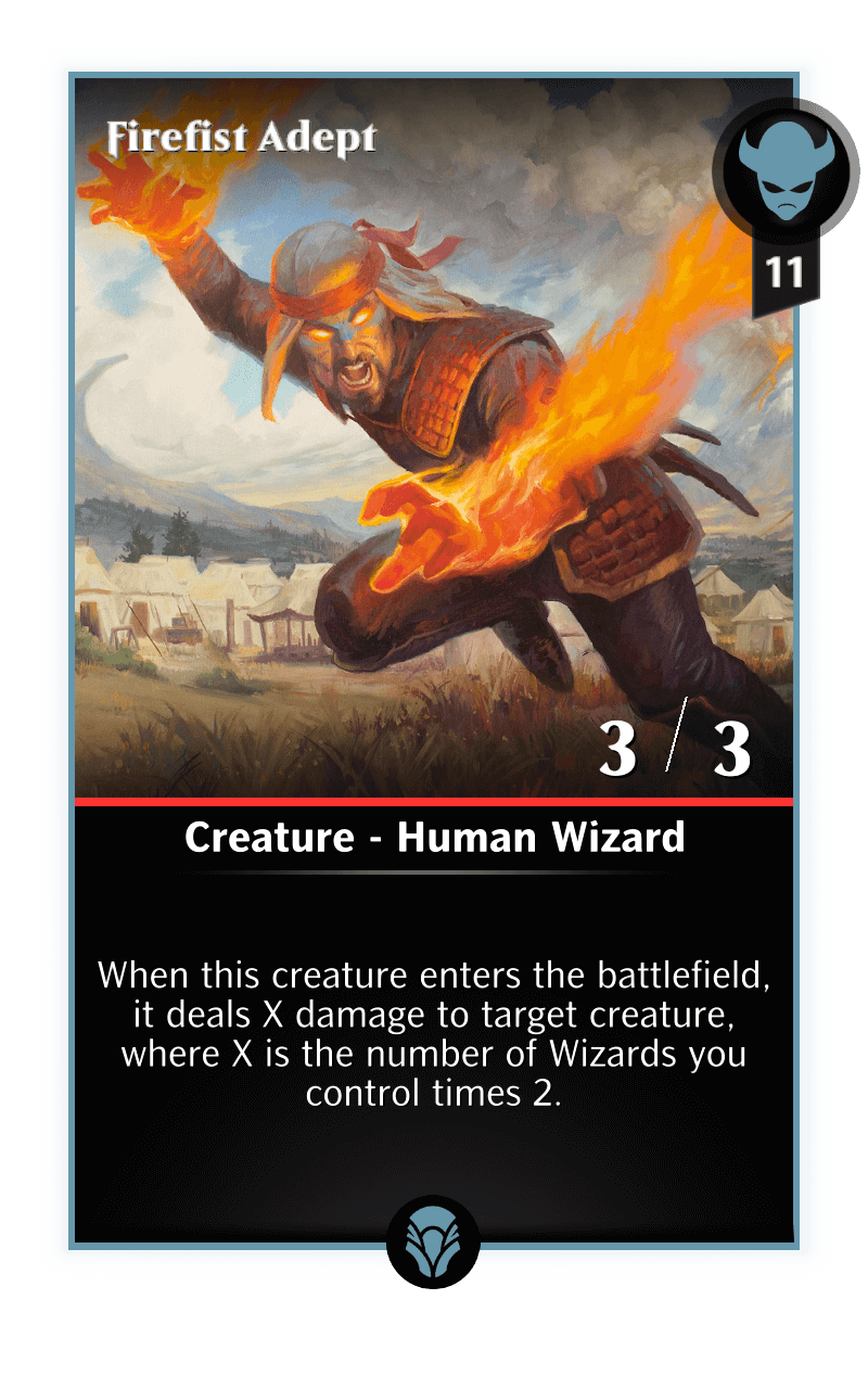 When this creature enters the battlefield, it deals X damage to target creature, where X is the number of Wizards you control times 2.