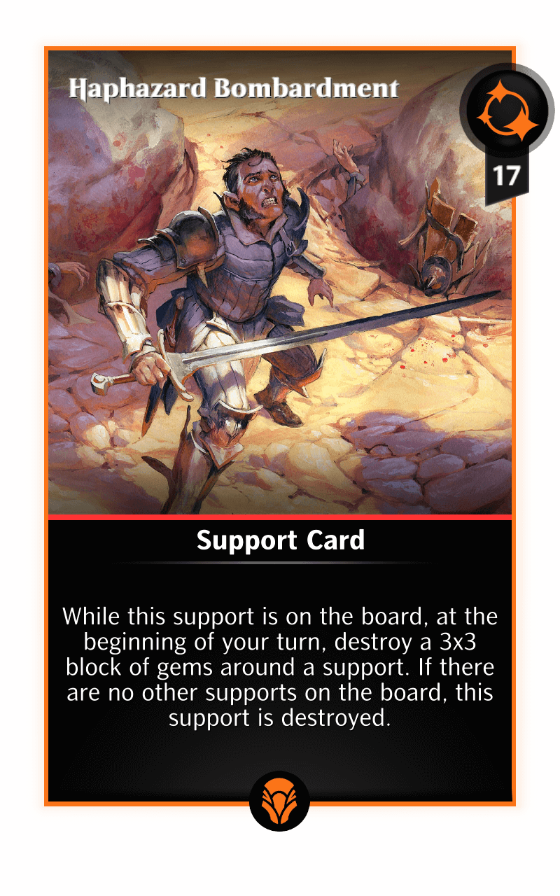 While this support is on the board, at the beginning of your turn, destroy a 3×3 block of gems around a support. If there are no other supports on the board, this support is destroyed.