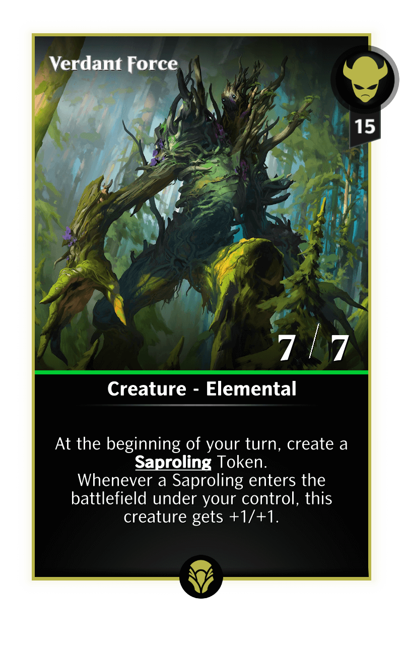 At the beginning of your turn, create a Saproling Token. Whenever a Saproling enters the battlefield under your control, this creature gets +1/+1.