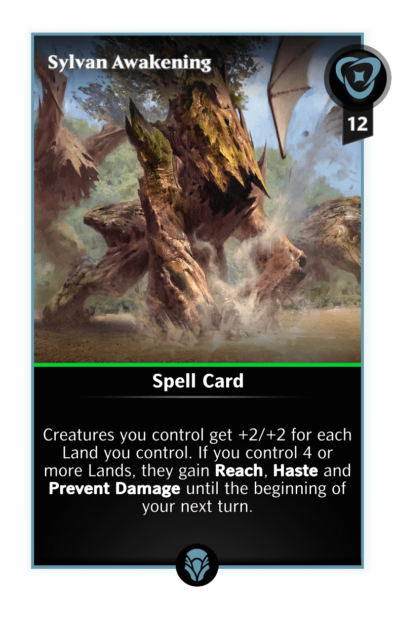 Creatures you control get +2/+2 for each Land you control. If you control 4 or more Lands, they gain Reach, Haste and Prevent Damage until the beginning of your next turn.