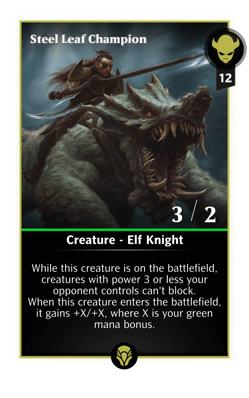 While this creature is on the battlefield, creatures with power 3 or less your opponent controls can’t block. When this creature enters the battlefield, it gains +X/+X, where X is your green mana bonus.