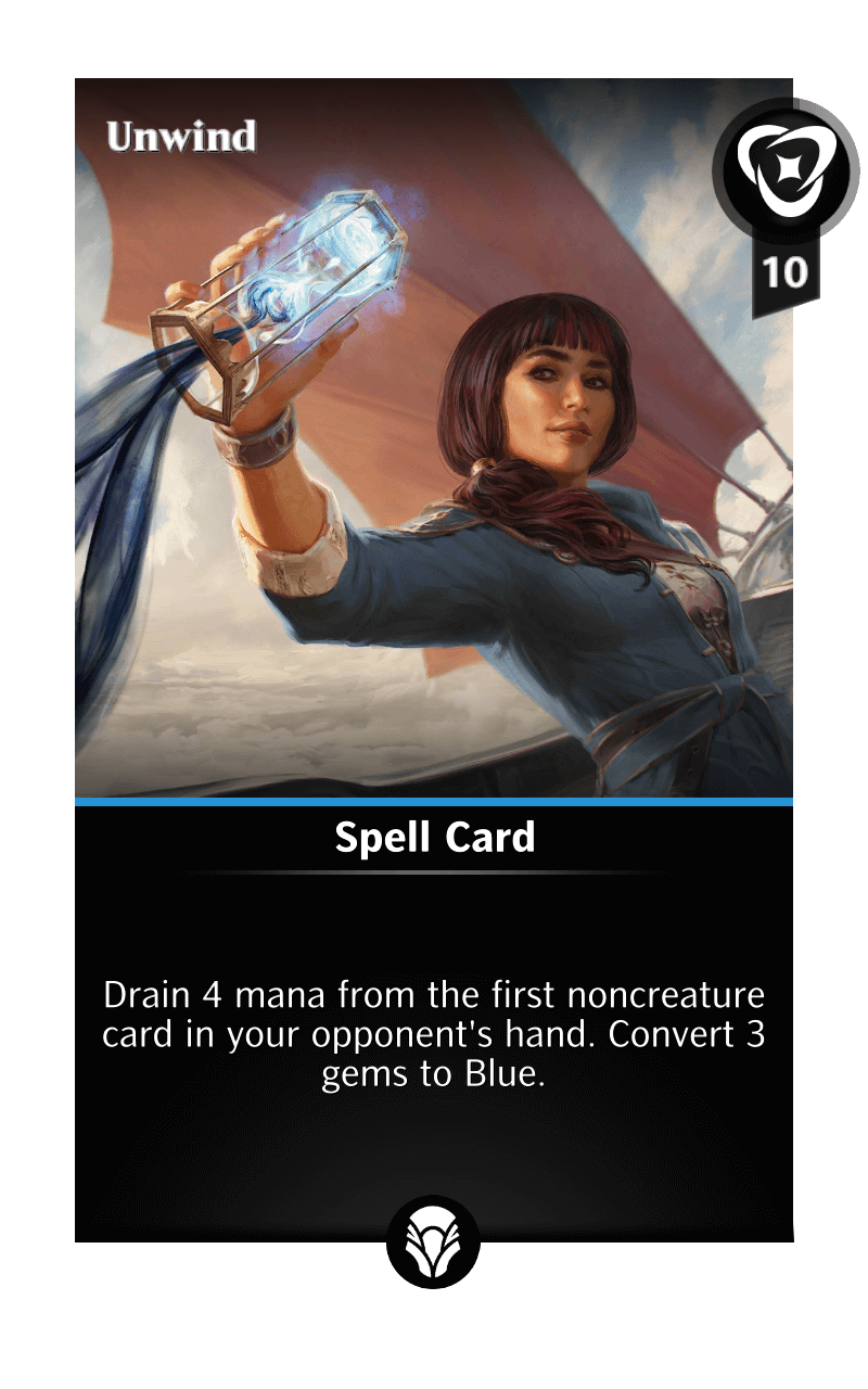 Drain 4 mana from the first noncreature card in your opponent’s hand. Convert 3 gems to Blue.
