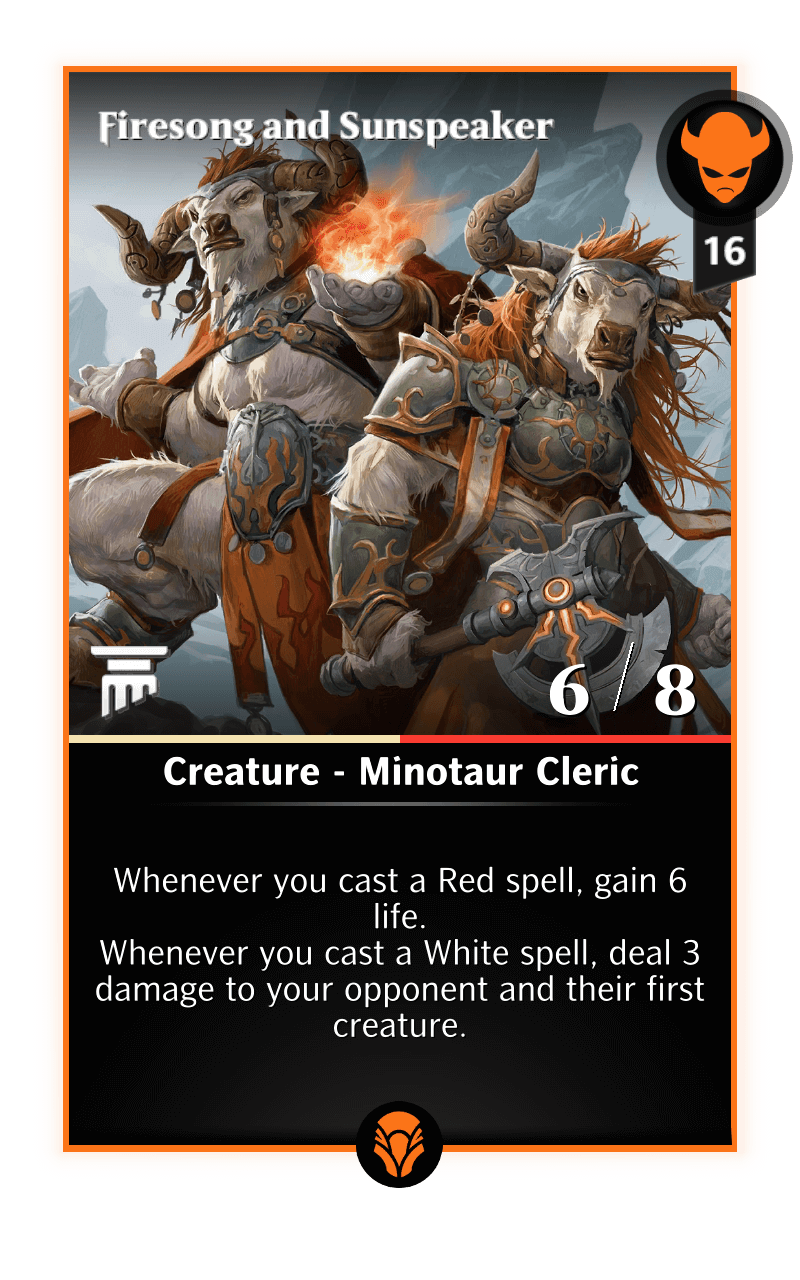 Whenever you cast a Red spell, gain 6 life. Whenever you cast a White spell, deal 3 damage to your opponent’s and their first creature.