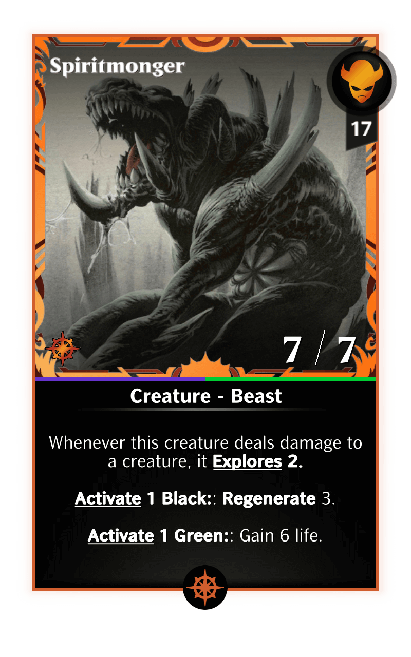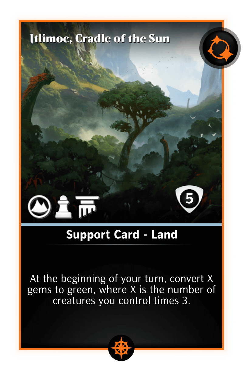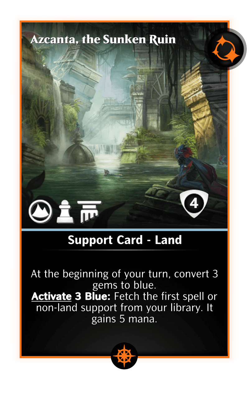 At the beginning of your turn convert 2 gems to blue.Activate 2 Blue: Fetch the first spell or nonland support from your library, it gains 3 mana.