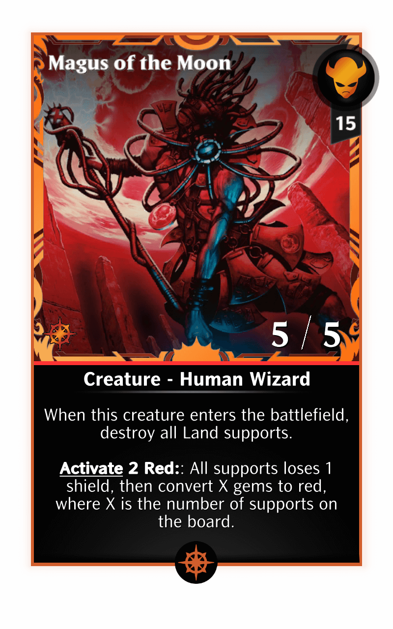 At the beginning of your turn, convert 2 gems to red.Activate 2 Red: Deals 3 damage to the last creature your opponent controls.