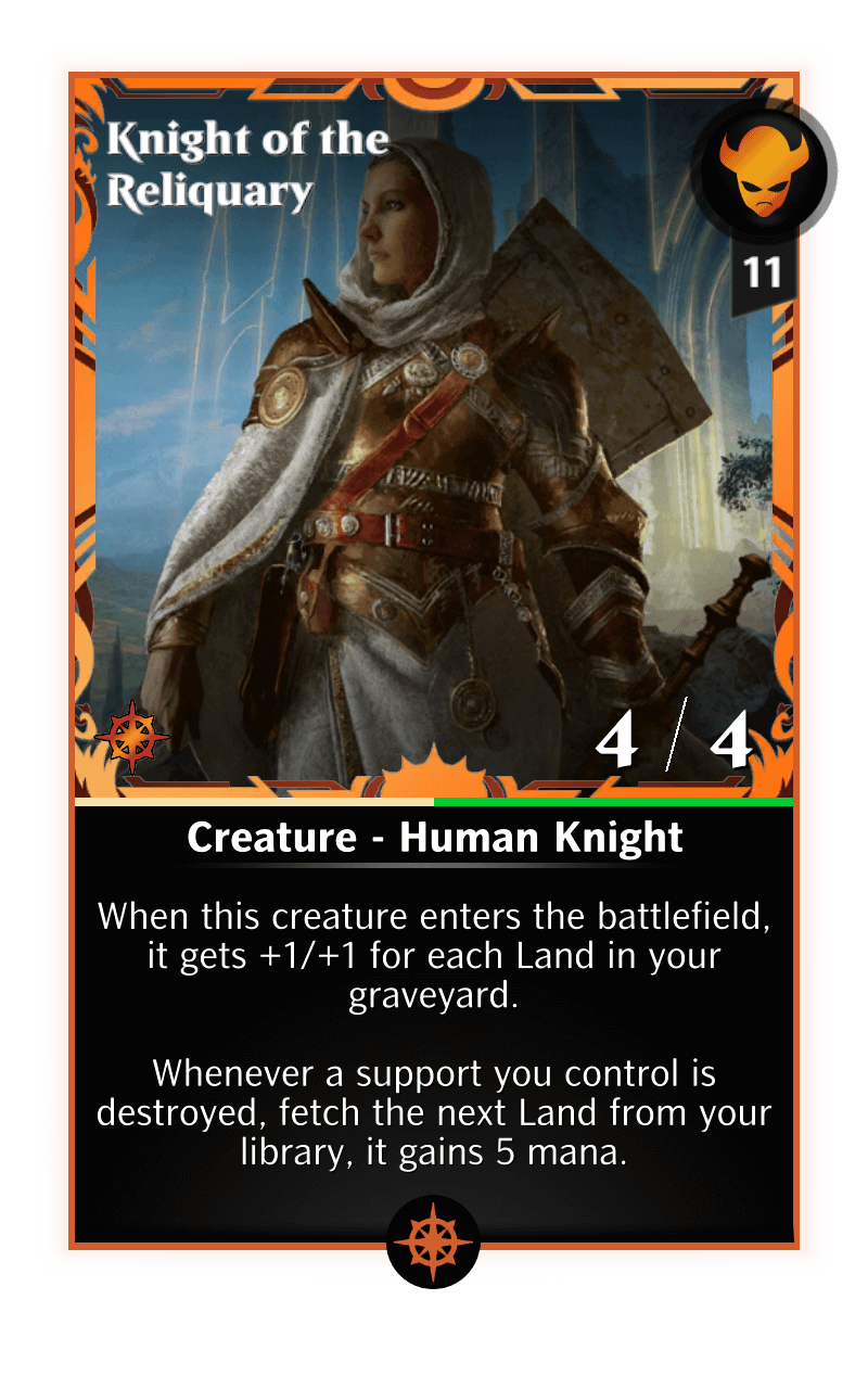 Whenever a support you control is destroyed, fetch the next Land from your library, it gains 5 mana.”