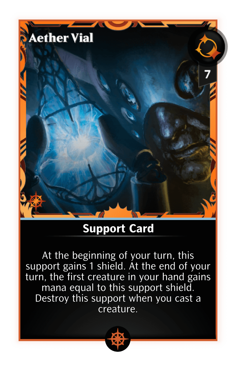 At the beginning of your turn, this support gains 1 shield. At the end of your turn, the first creature in your hand gains mana equal to this support shield. Destroy this support when you cast a creature.