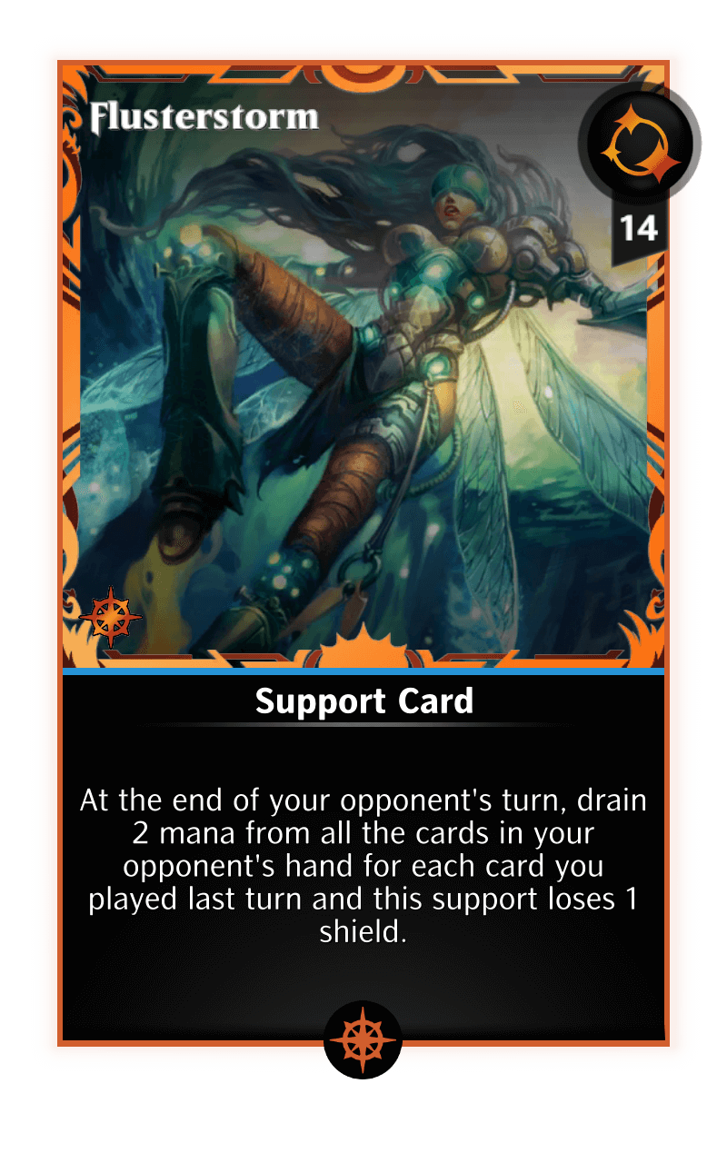 At the end of your opponent’s turn, drain 2 mana from all the cards in your opponent’s hand for each card you played last turn and this support loses 1 shield.