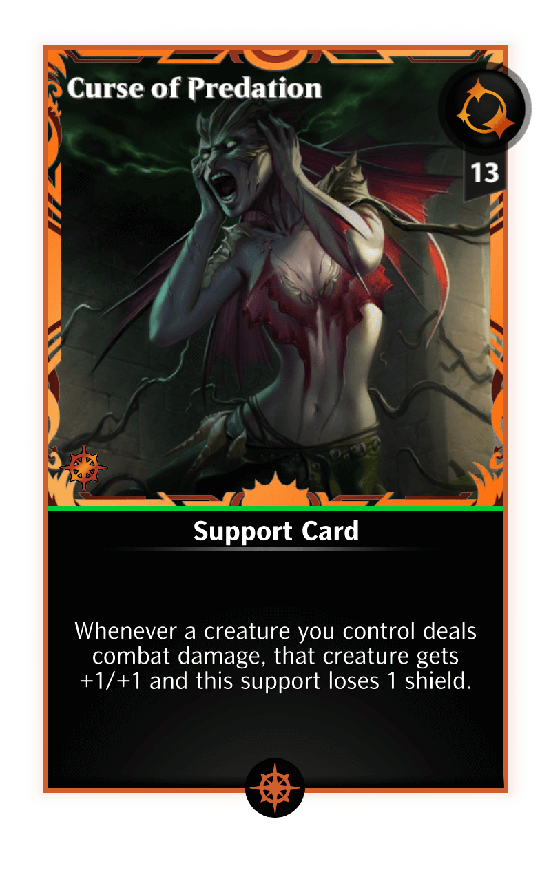 Whenever a creature you control deals combat damage, that creature gets +1/+1 and this support loses 1 shield.