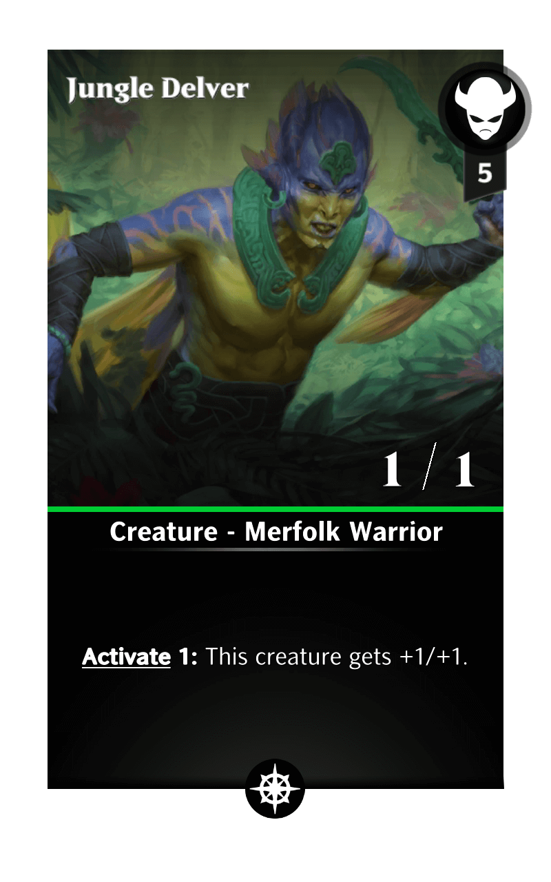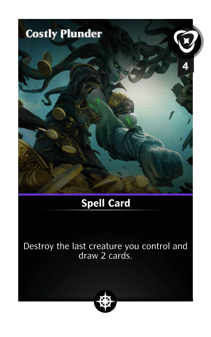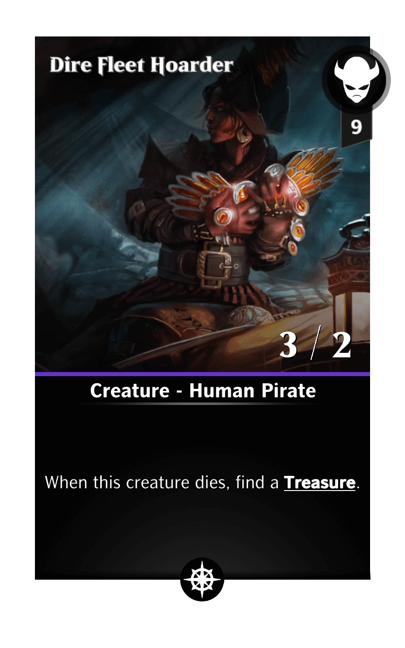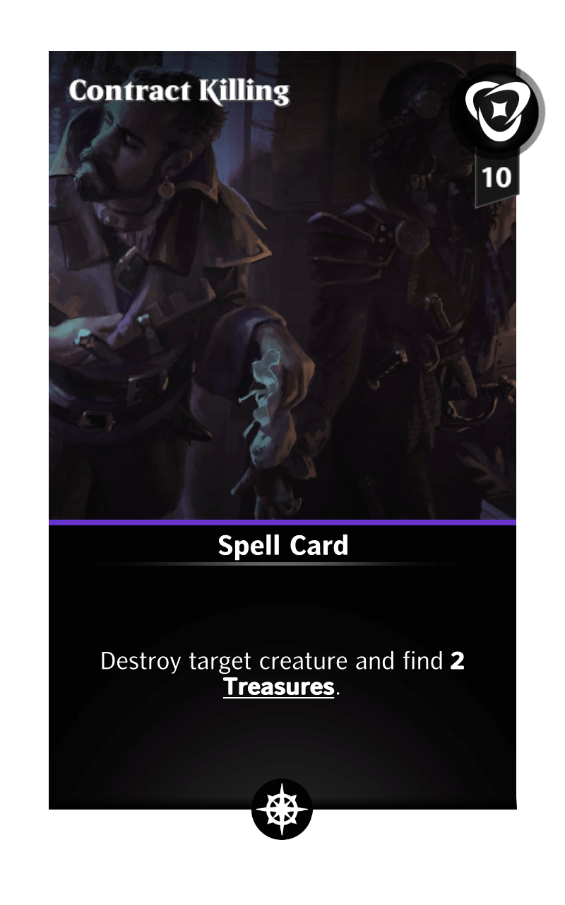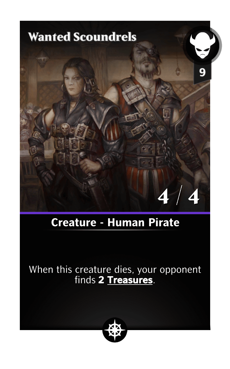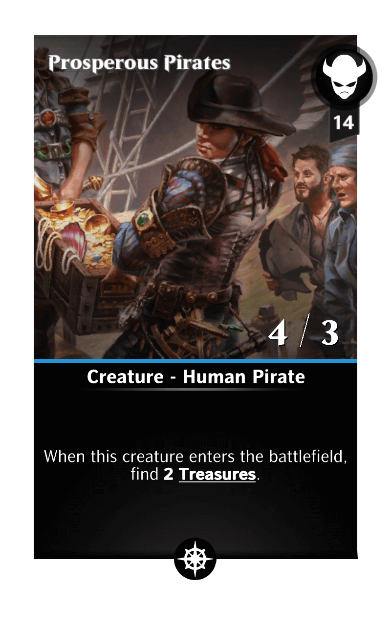 Activate 1: The first other creature you control is destroyed and you find 2 Treasures.At the end of your turn, if you control more than 3 Treasures, draw a card.
