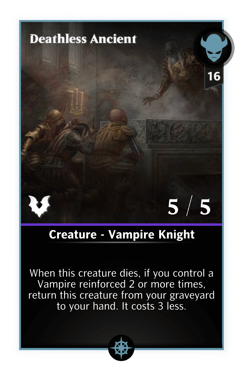 When this creature dies, if you control a Vampire reinforced 2 or more times, return this creature from your graveyard to your hand. It costs 3 less.