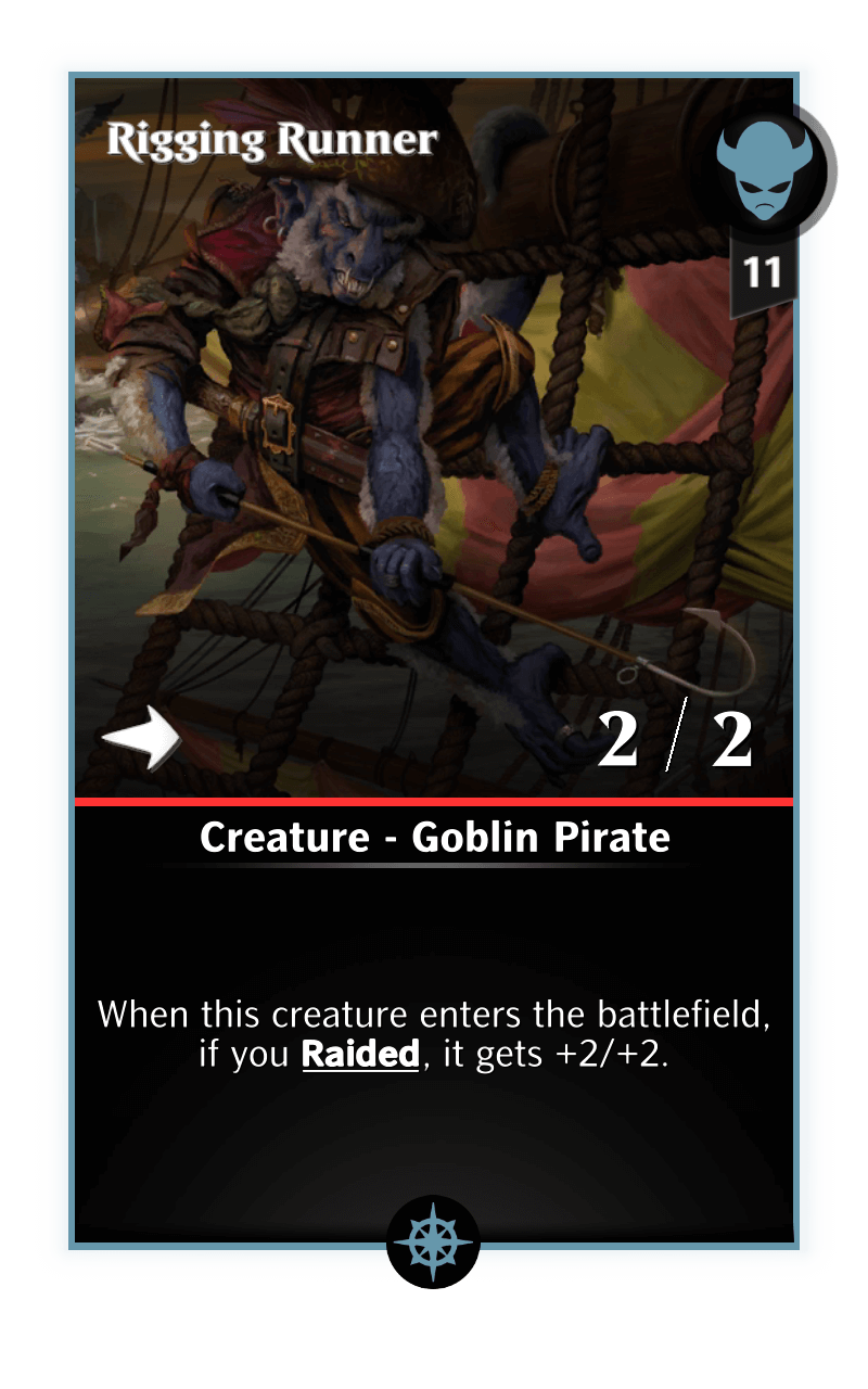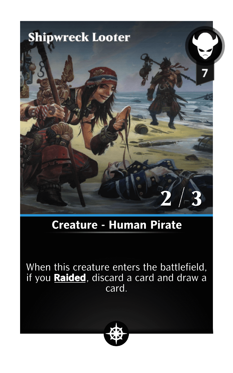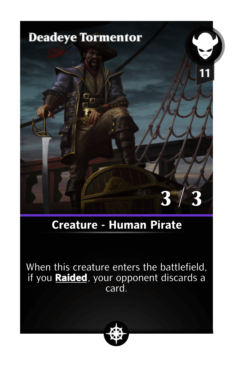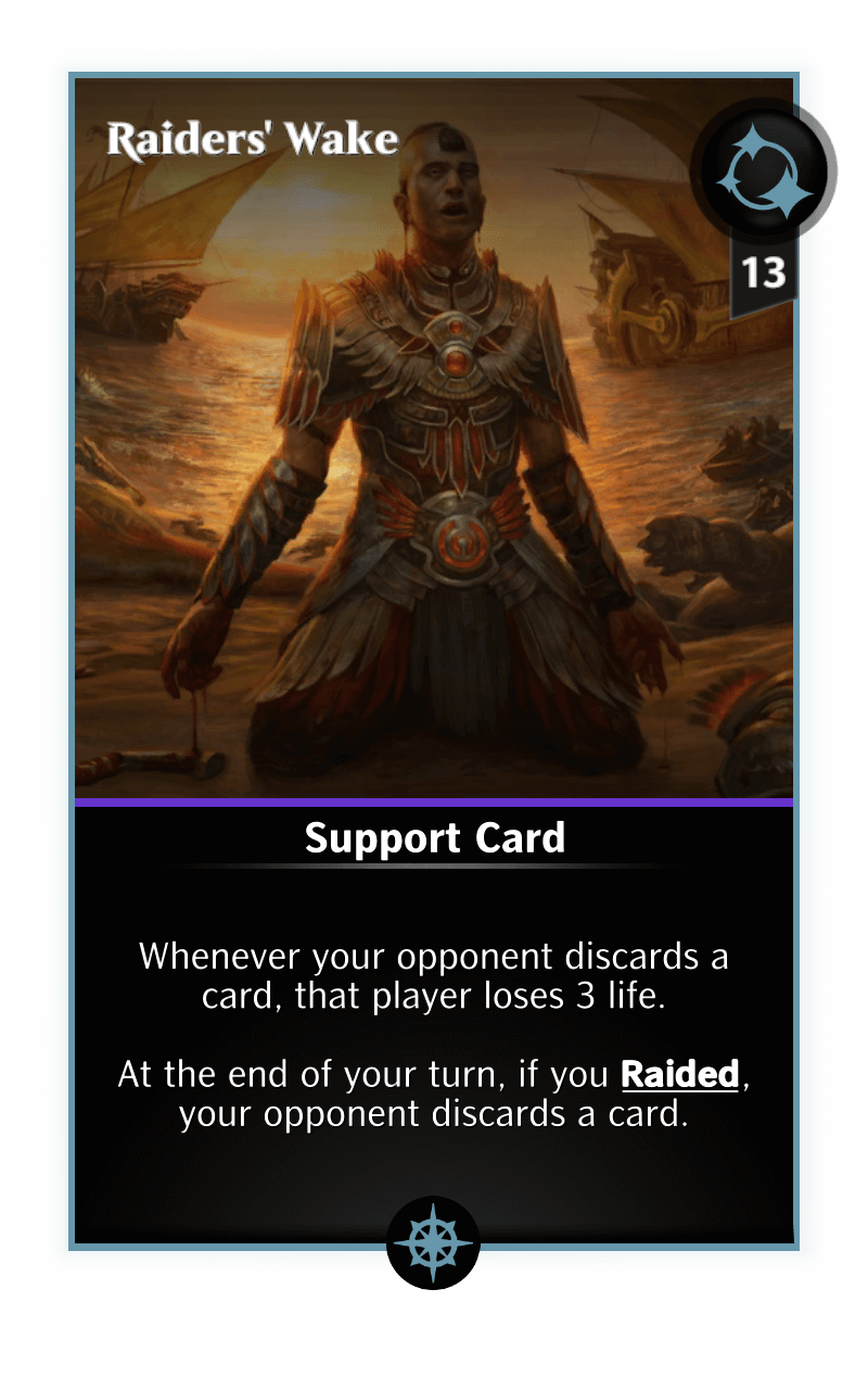 Whenever your opponent discards a card, that player loses 3 life.At the end of your turn, if you Raided, your opponent discards a card.