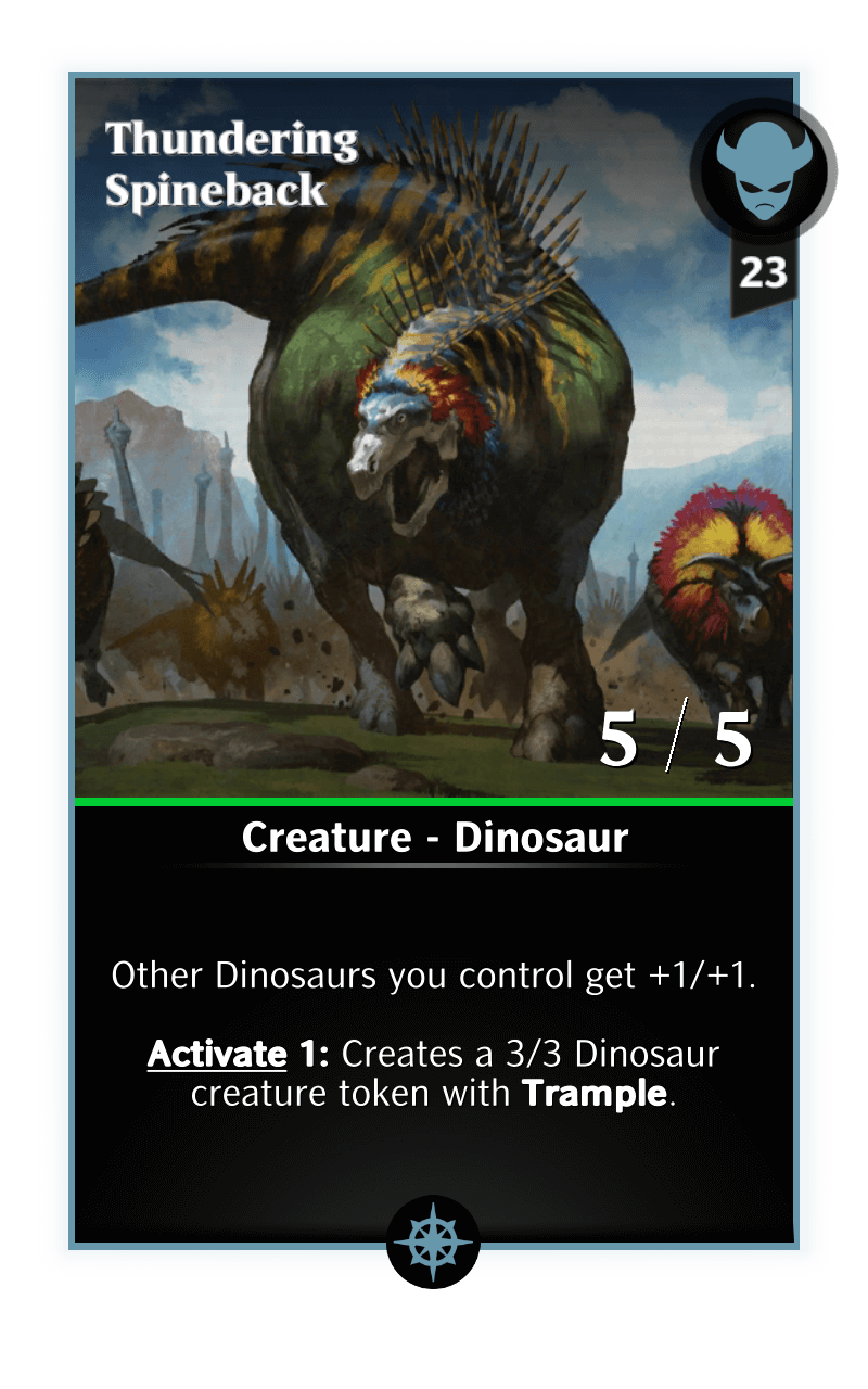 Other Dinosaurs you control get +1/+1.Activate 1: Creates a 3/3 Dinosaur creature token with Trample.
