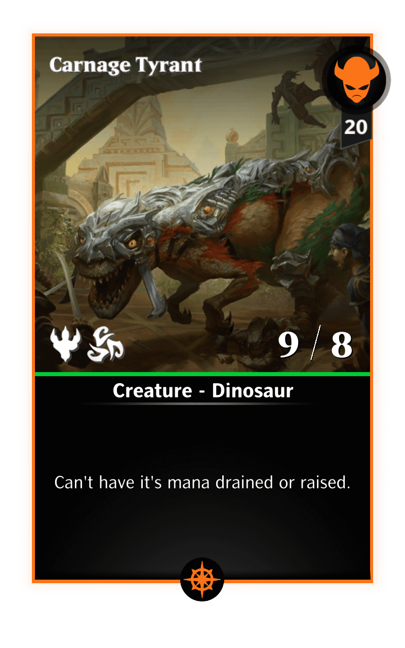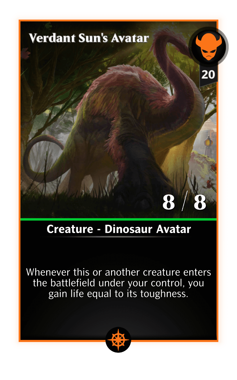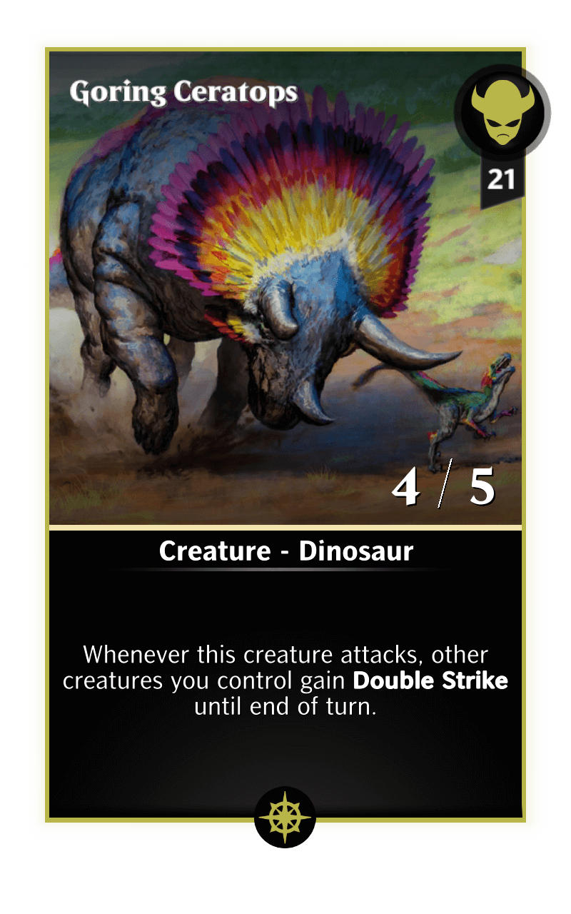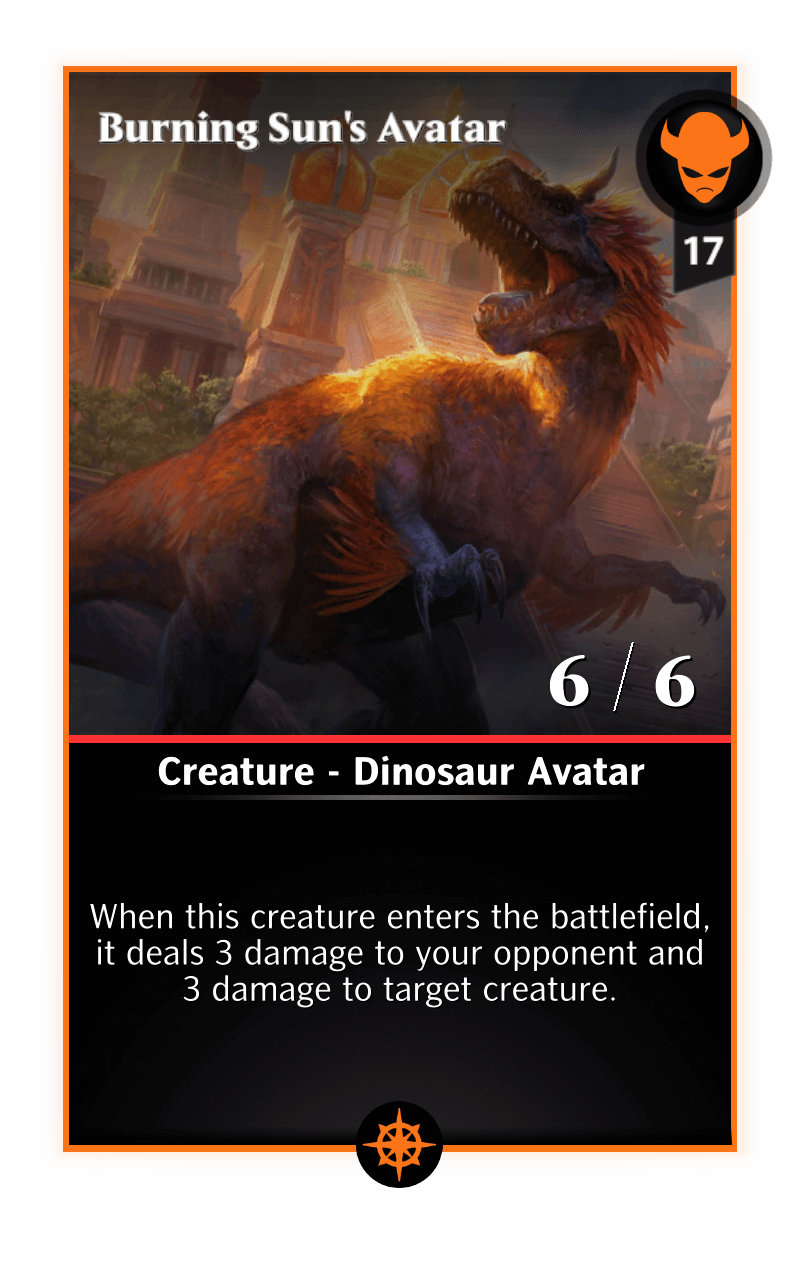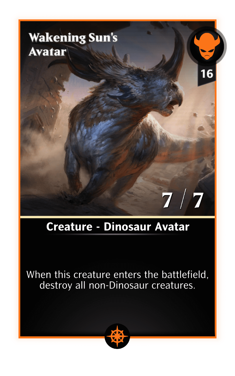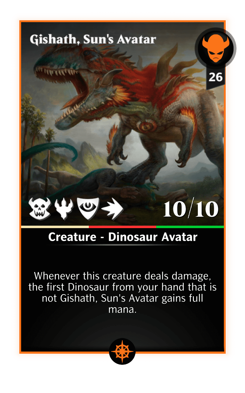 Whenever this creature deals damage, the first Dinosaur from your hand that is not Gishath, Sun’s Avatar gains full mana.
