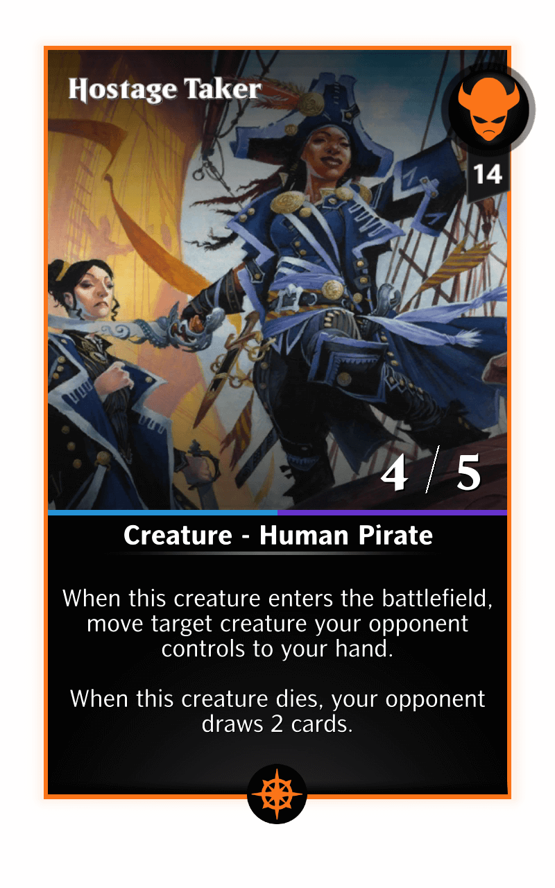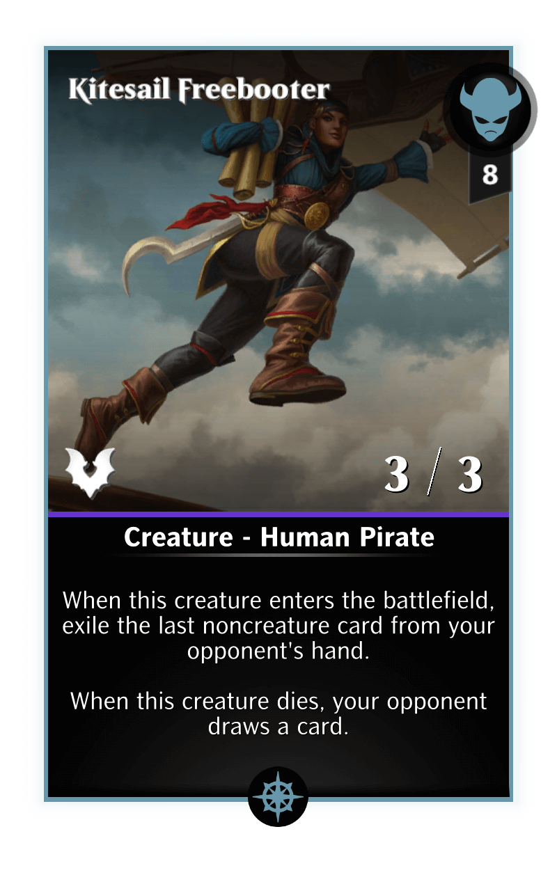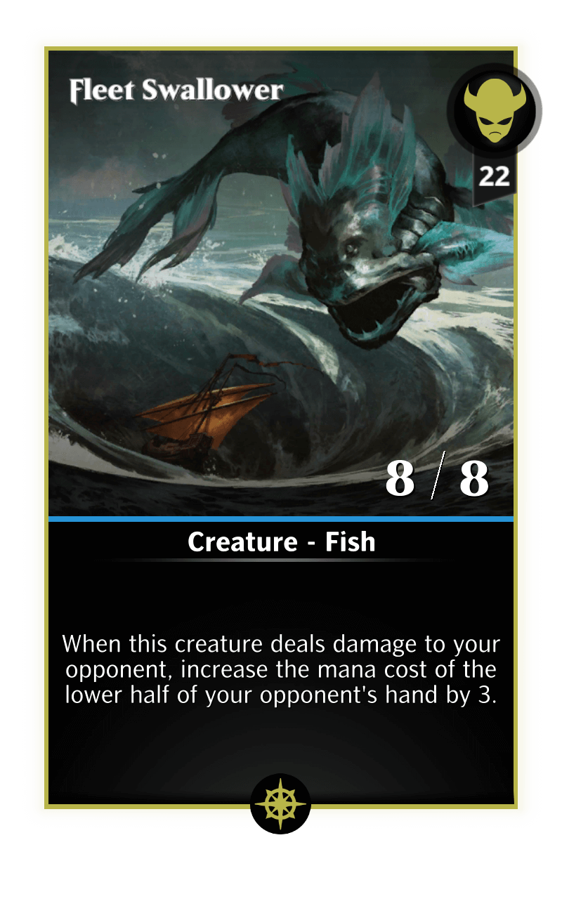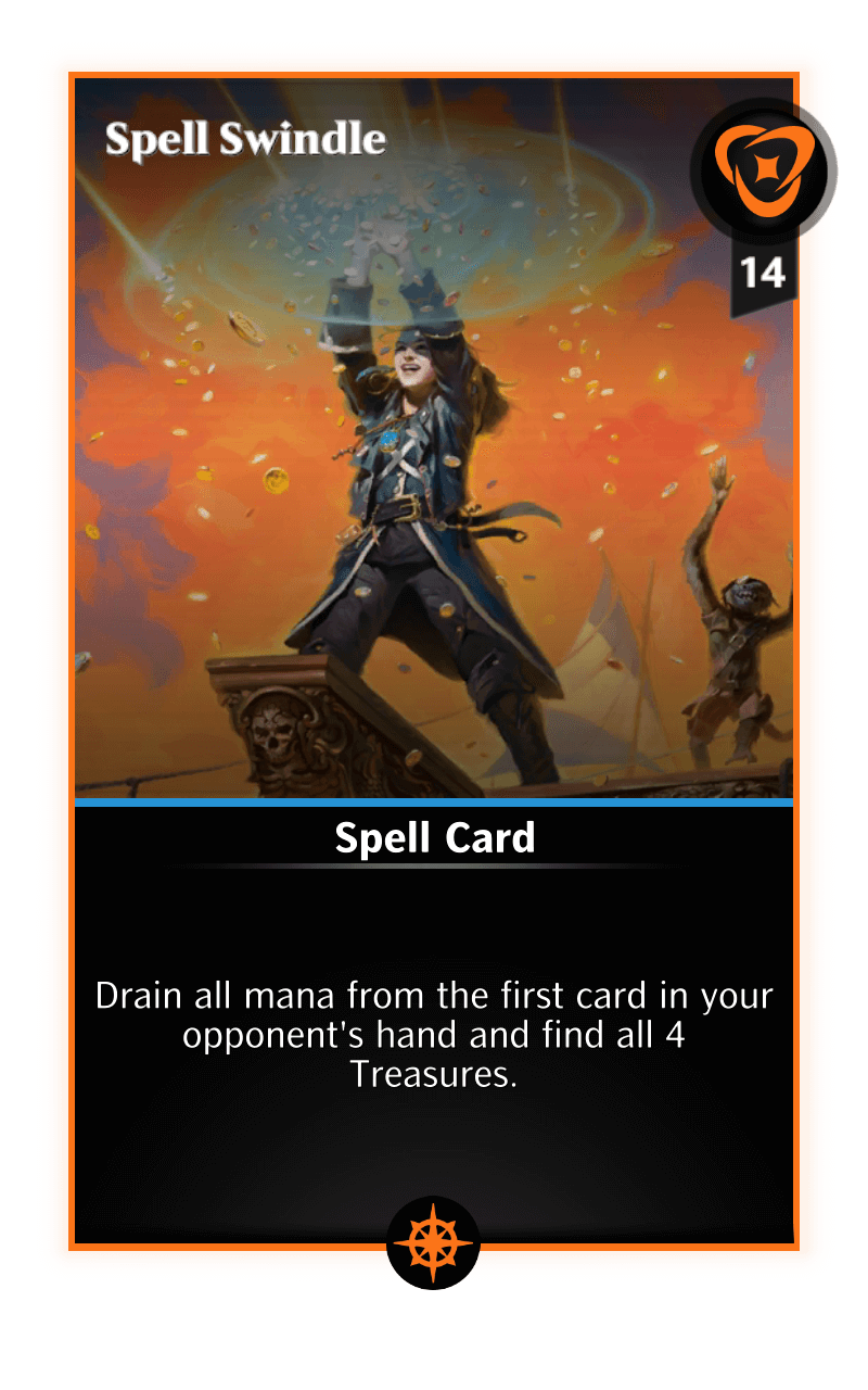 Whenever a Pirate enters the battlefield under your control, reduce this spell’s mana cost by 3.Drain 8 mana from the first card in your opponent’s hand.