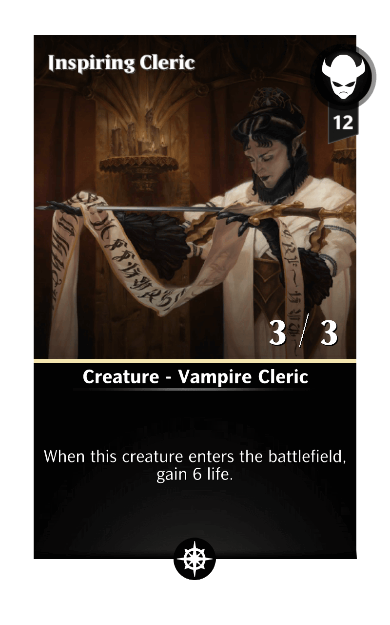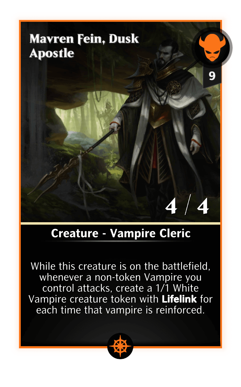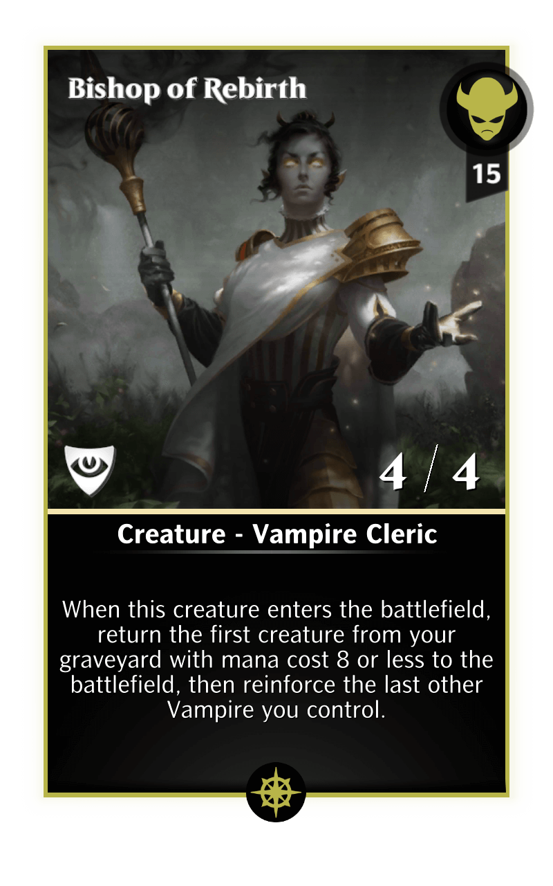 VigilanceWhen this creature enters the battlefield, return the first creature from your graveyard with mana cost 8 or less to the battlefield, then reinforce the last other Vampire you control.