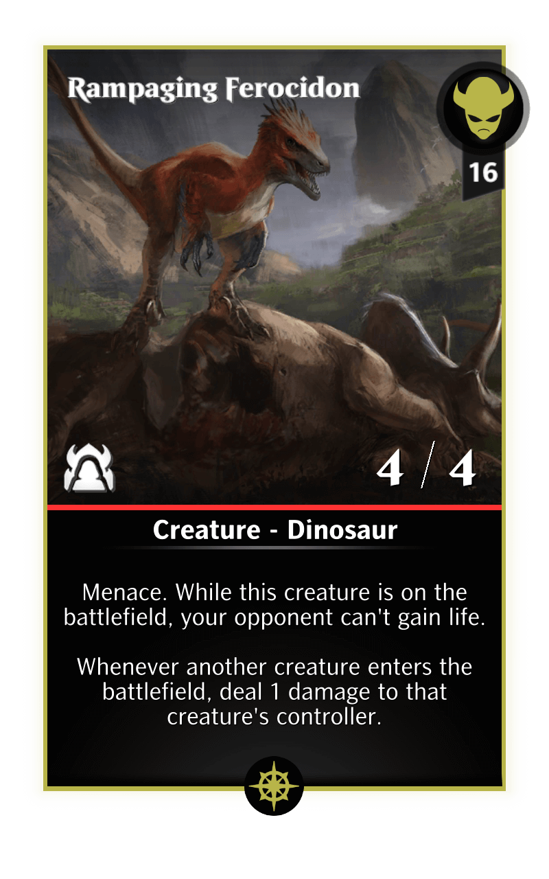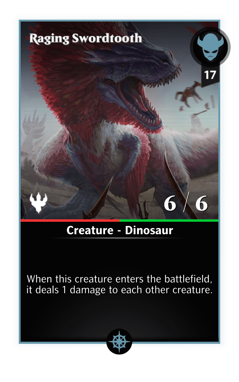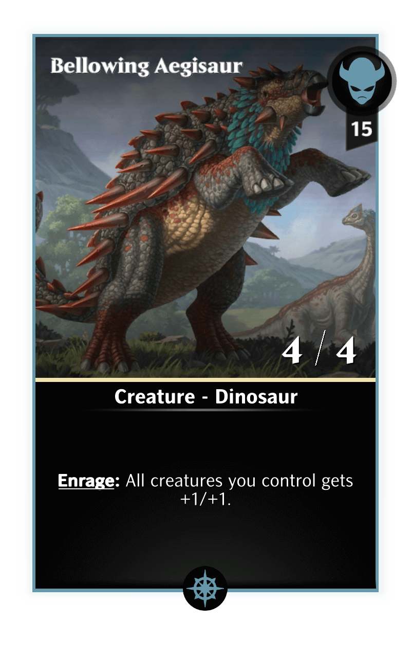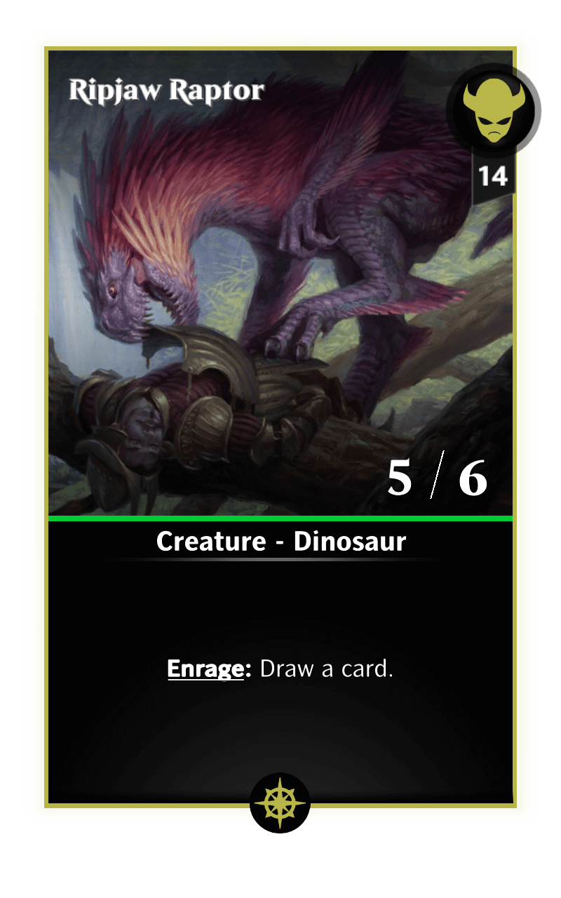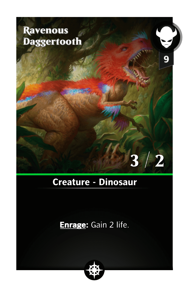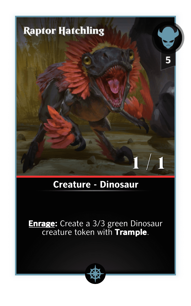 Enrage: Create a 3/3 green Dinosaur creature token with Trample.