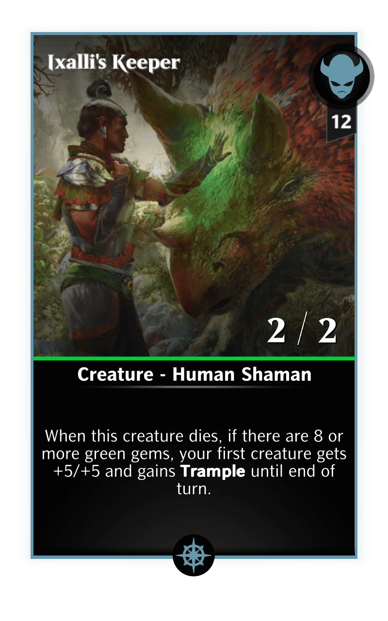 When this creature dies, if there are 8 or more green gems, your first creature gets +5/+5 and gains trample until end of turn.