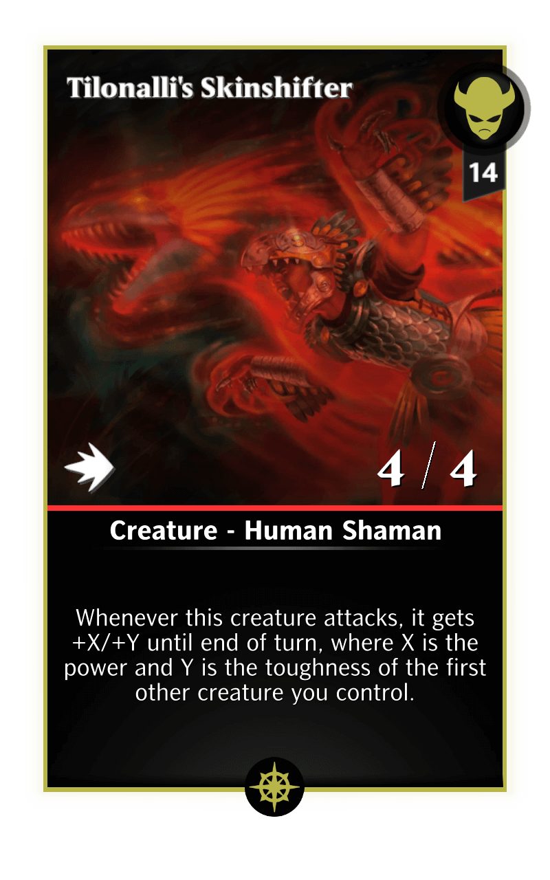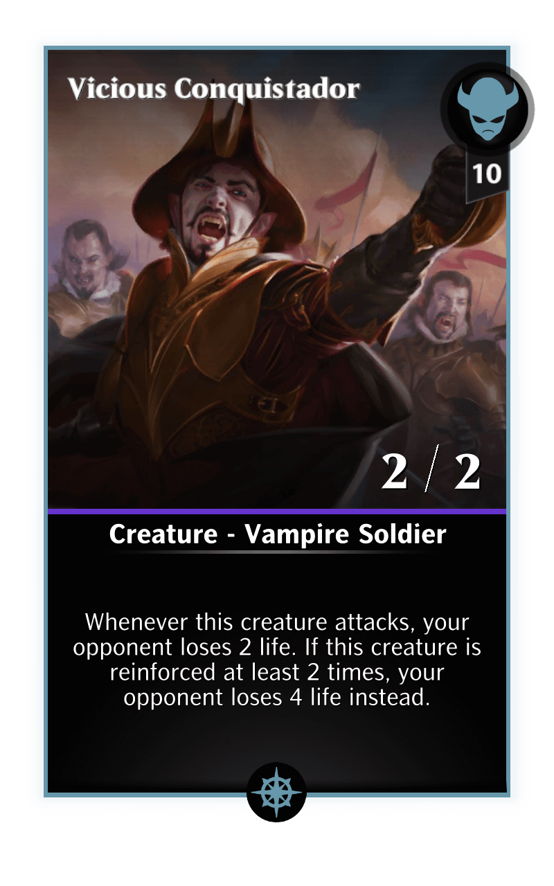 Whenever this creature attacks, your opponent loses 2 life. If this creature is reinforced at least 2 times, your opponent loses 4 life instead.
