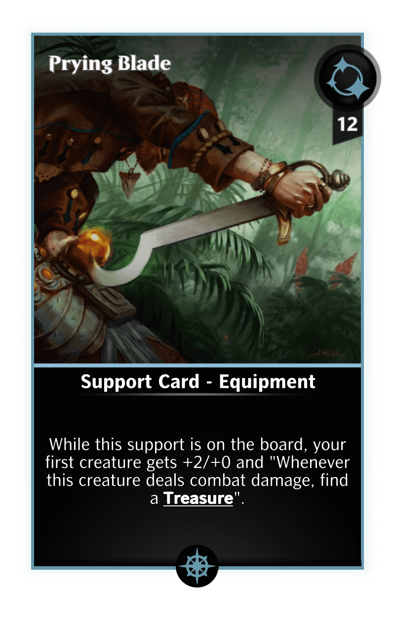 While this support is on the board, your first creature gets +2/+0 and “Whenever this creature deals combat damage, find a Treasure.”