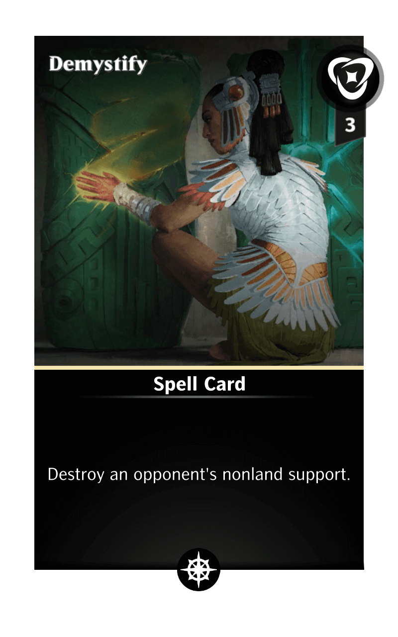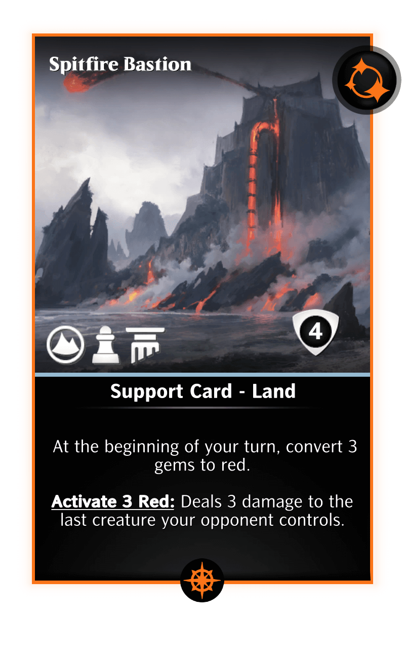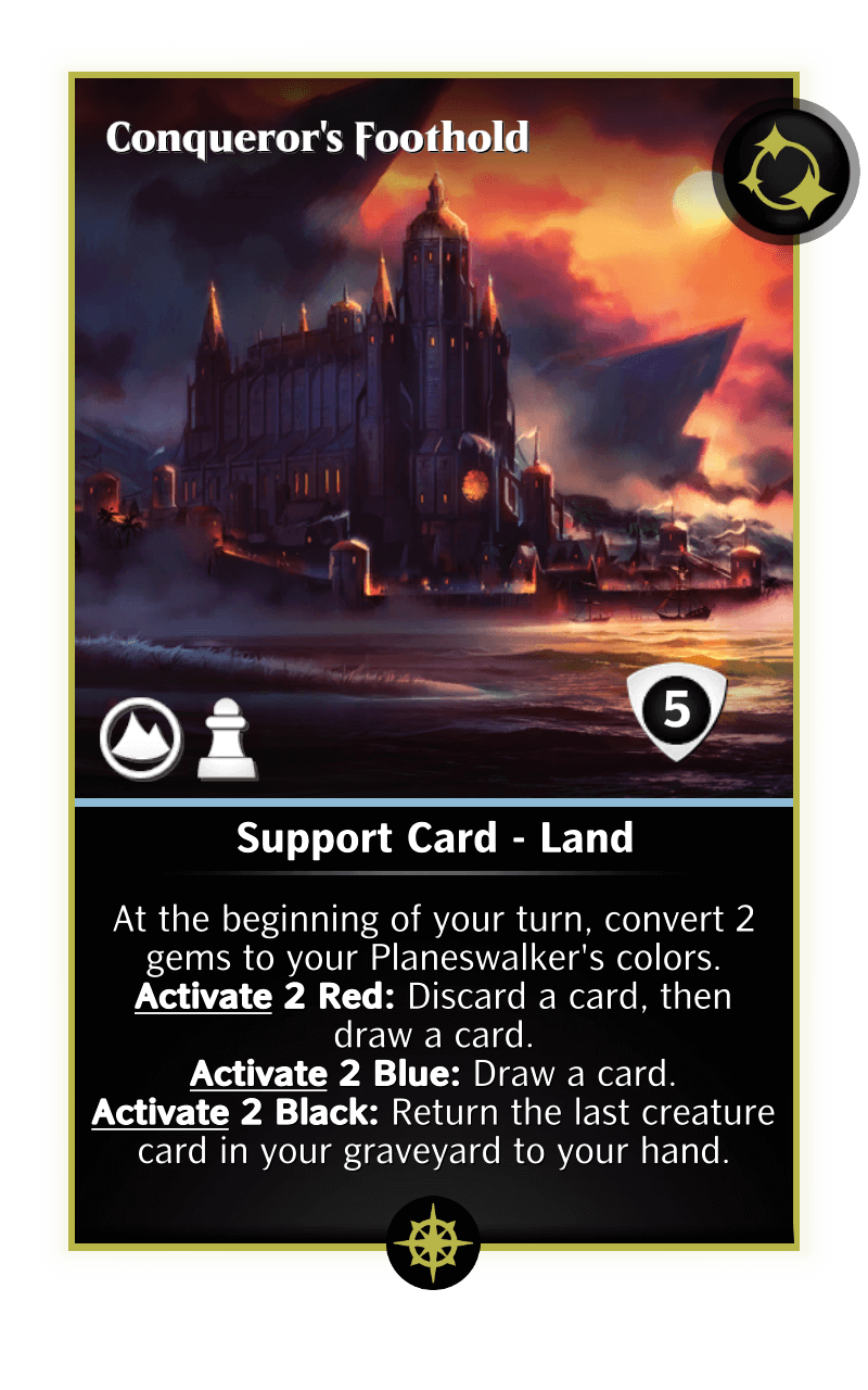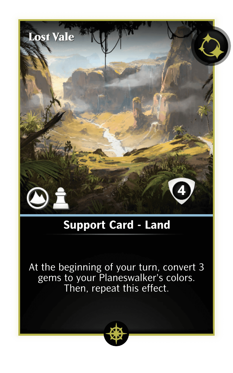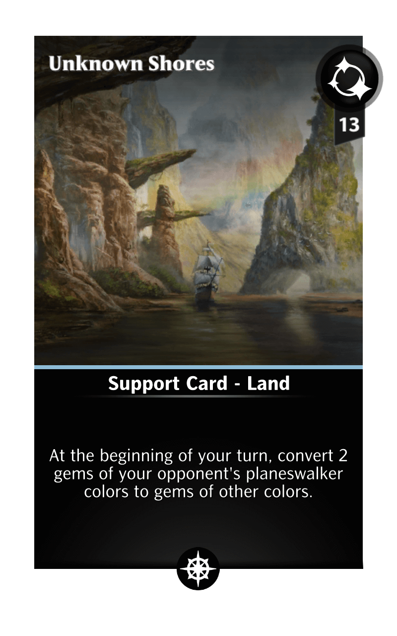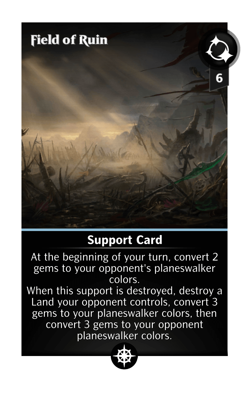 At the beginning of your turn, convert 2 gems to your opponent’s planeswalker colors.When this support is destroyed, destroy a Land your opponent controls, convert 3 gems to your planeswalker colors, then convert 3 gems to your opponent planeswalker colors.