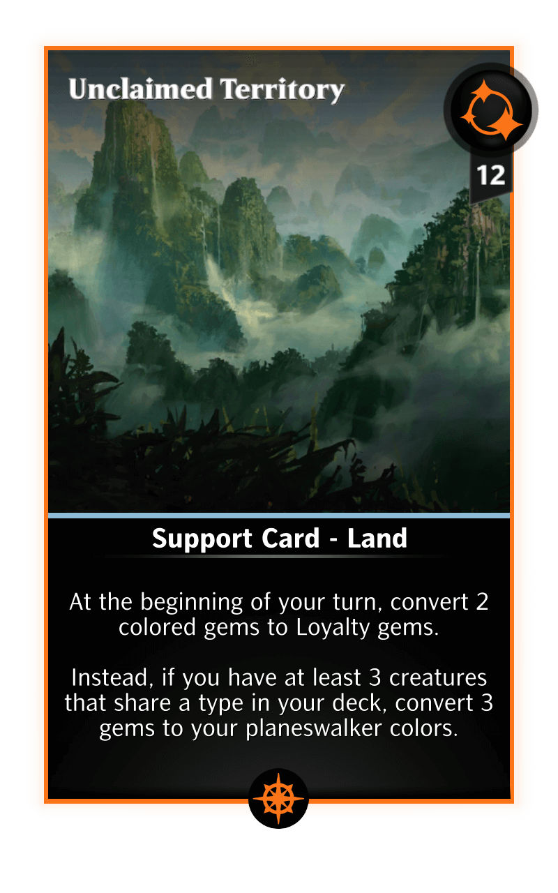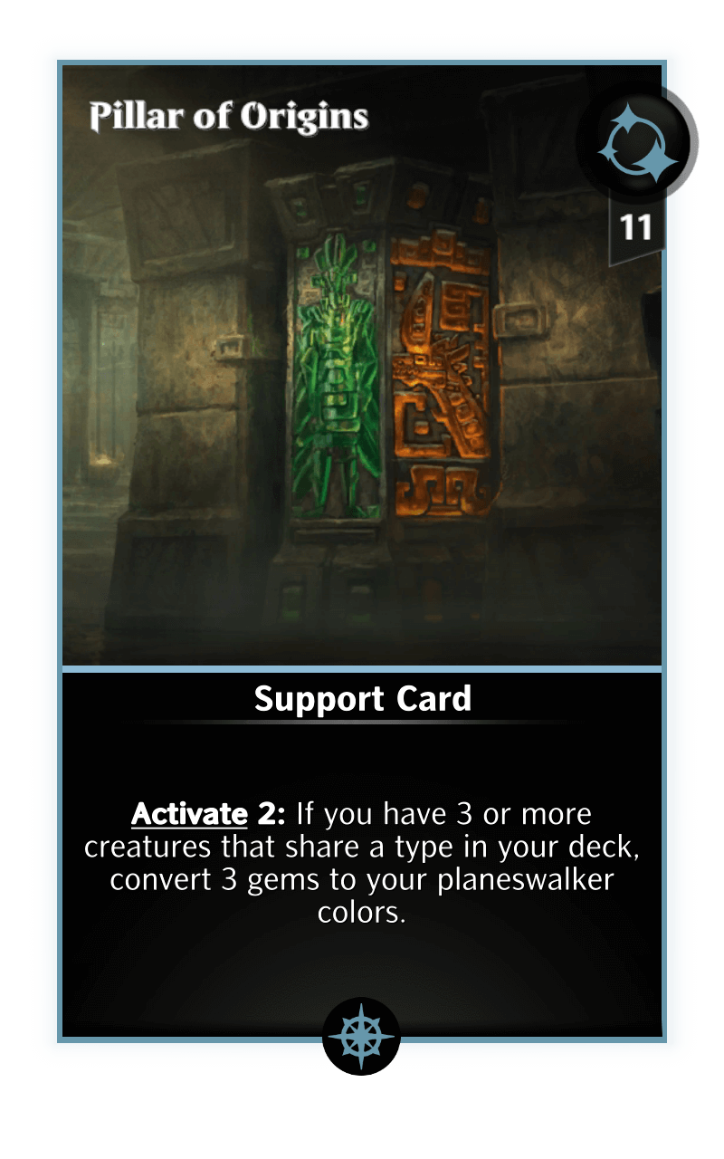 At the beginning of your turn, convert 2 colored gems to Loyalty gems.Instead, if you have at least 3 creatures that share a type in your deck, convert 3 gems to your planeswalker colors.