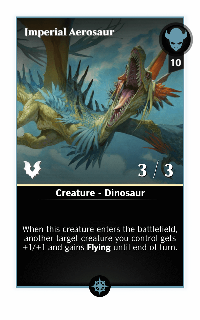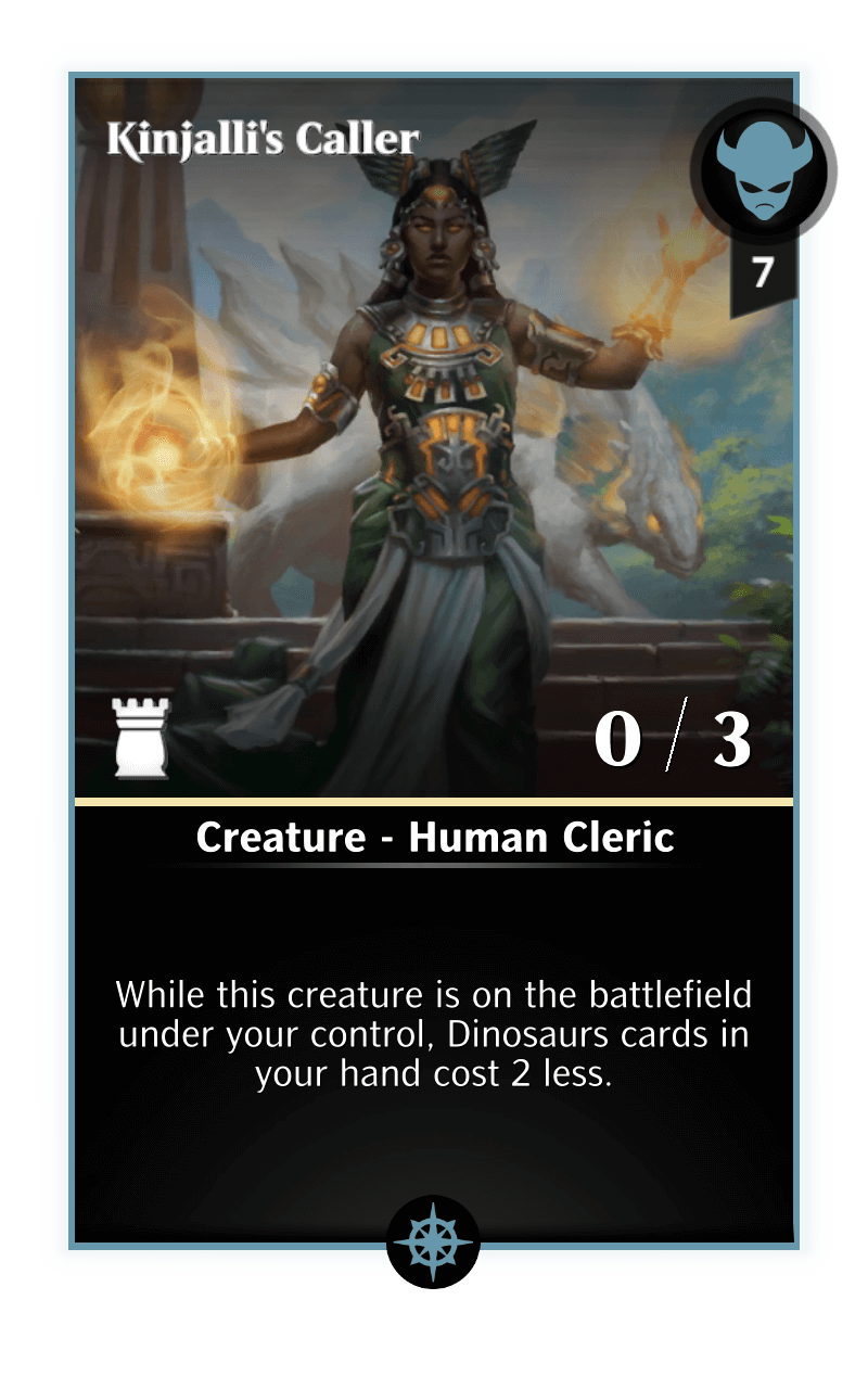 Defender. While this creature is on the battlefield under your control, Dinosaurs cards in your hand cost 2 less.