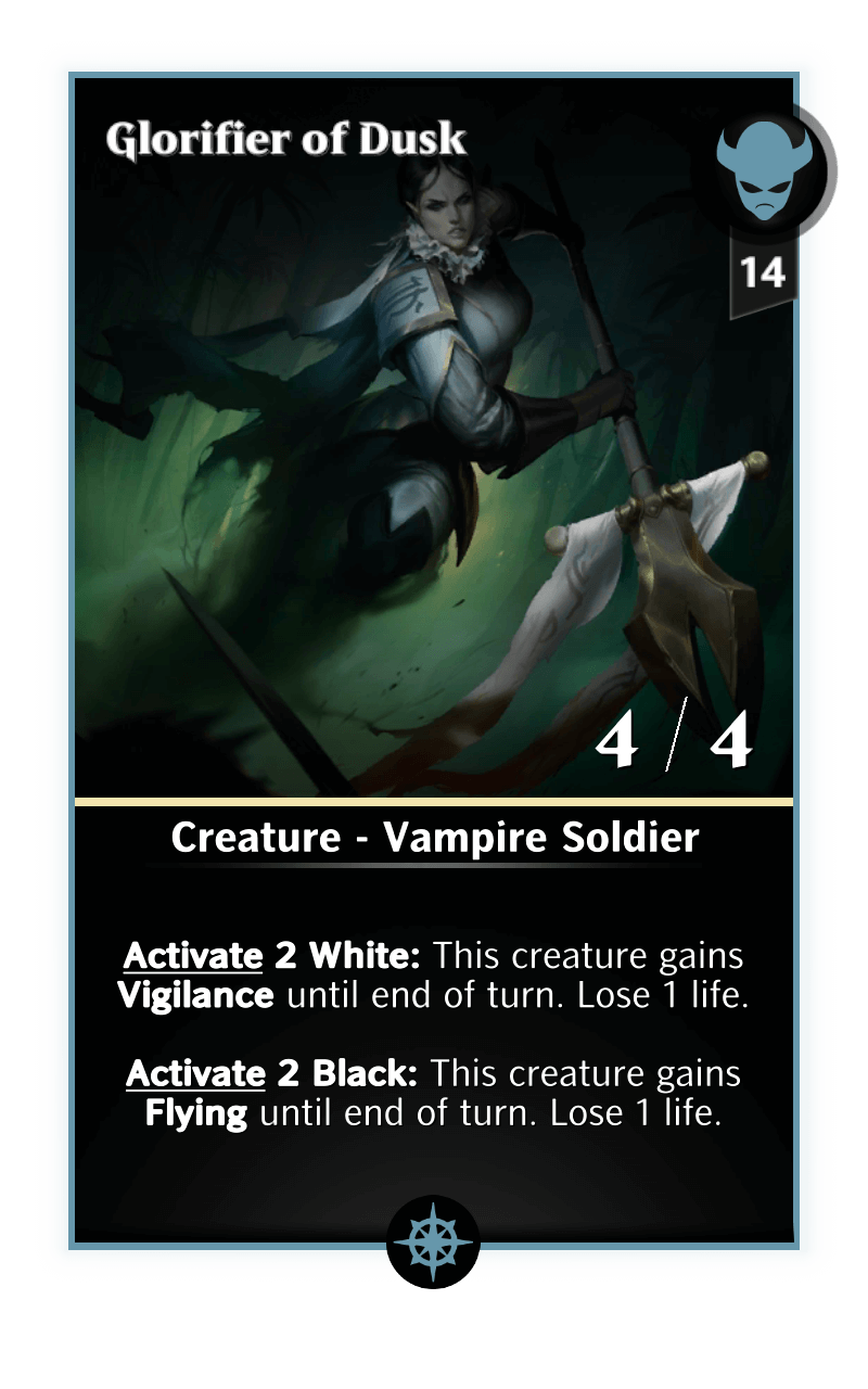 Activate White 2: This creature gains Vigilance until end of turn. Lose 1 life.Activate Black 2: This creature gains Flying until end of turn. Lose 1 life.