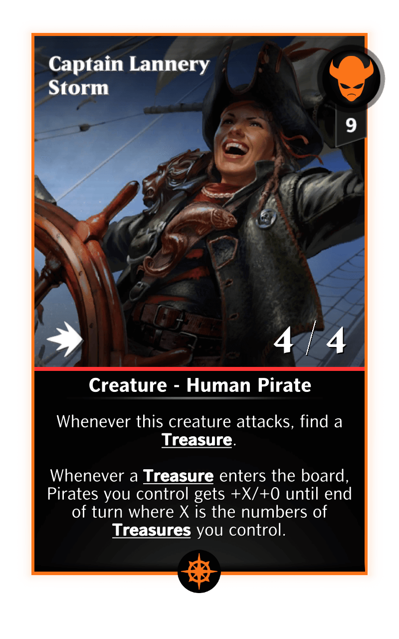 Whenever this creature attacks, find a Treasure.Whenever a Treasure enters the board, Pirates you control get +X/+0 until end of turn where X is the number of Treasures you control.
