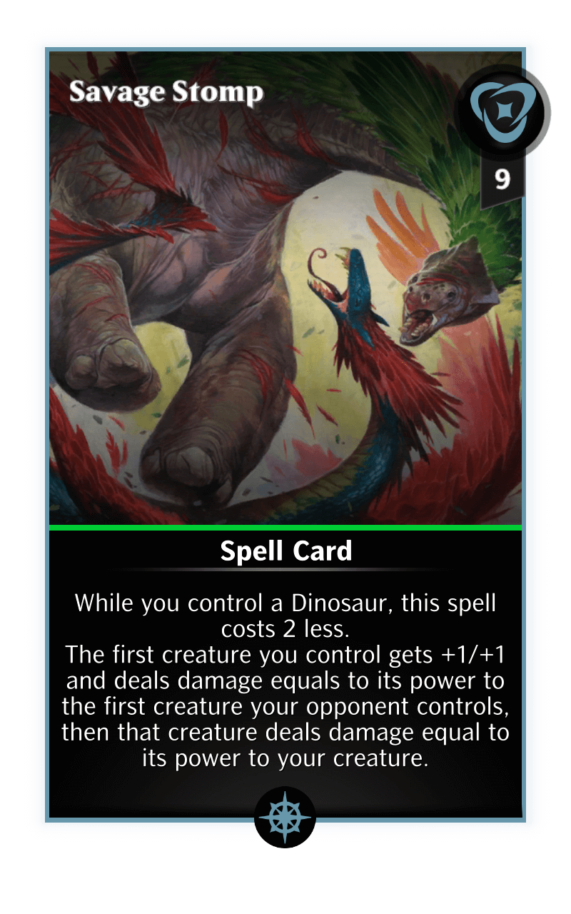 While you control a Dinosaur, this spell costs 2 less.The first creature you control gets +1/+1 and deals damage equals to its power to the first creature your opponent controls, then that creature deals damage equal to its power to your creature.