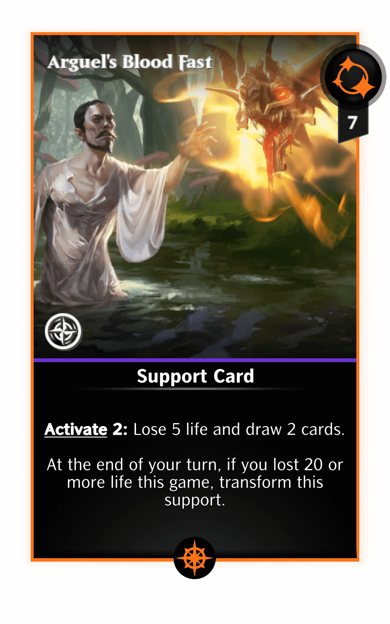 Activate 2: Lose 5 life and draw 2 cards.At the end of your turn, if you lost 20 or more life this game, transform this support.