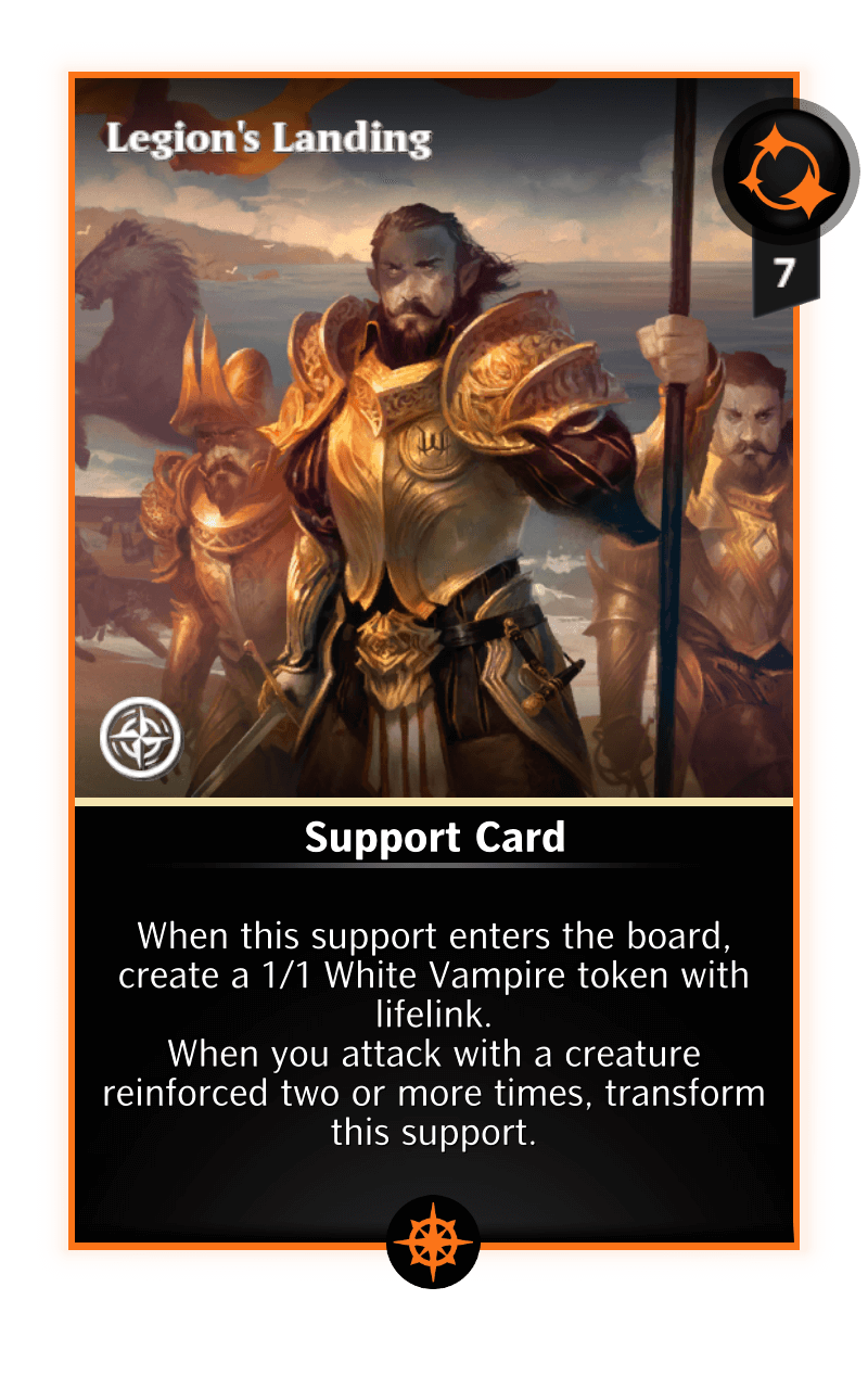 When this support enters the board, create a 1/1 White Vampire token with lifelink.When you attack with a creature reinforced two or more times, transform this support.