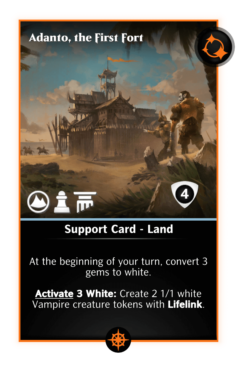 At the beginning of your turn, convert 2 gems to white.Activate 2 White: Create 2 1/1 white Vampire creature tokens with Lifelink.