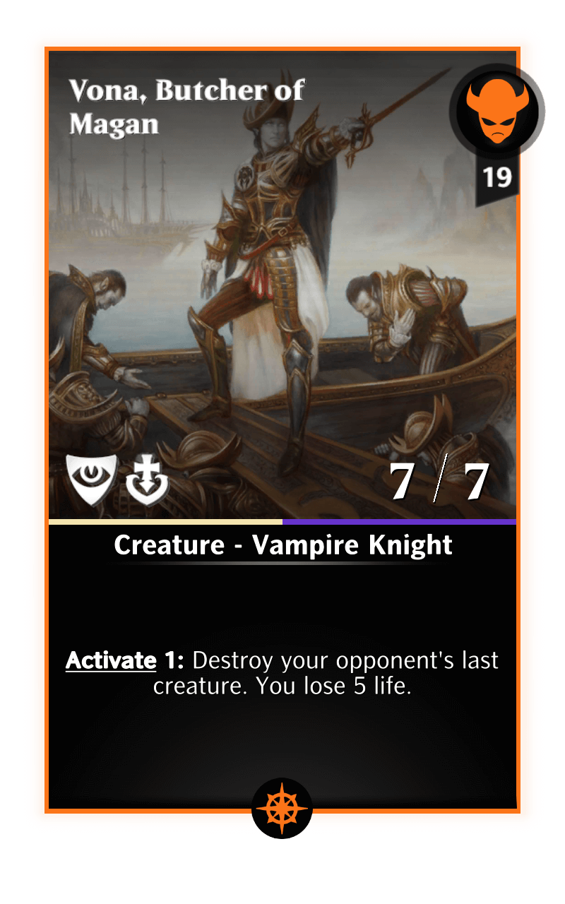 Activate 1: Destroy your opponent’s last creature. You lose 5 life.
