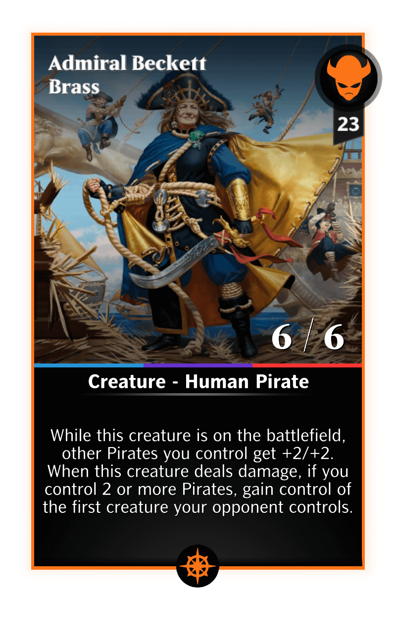 While this creature is on the battlefield, other Pirates you control get +2/+2.When this creature deals damage, if you control 2 or more Pirates, gain control of the first creature your opponent controls.